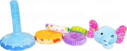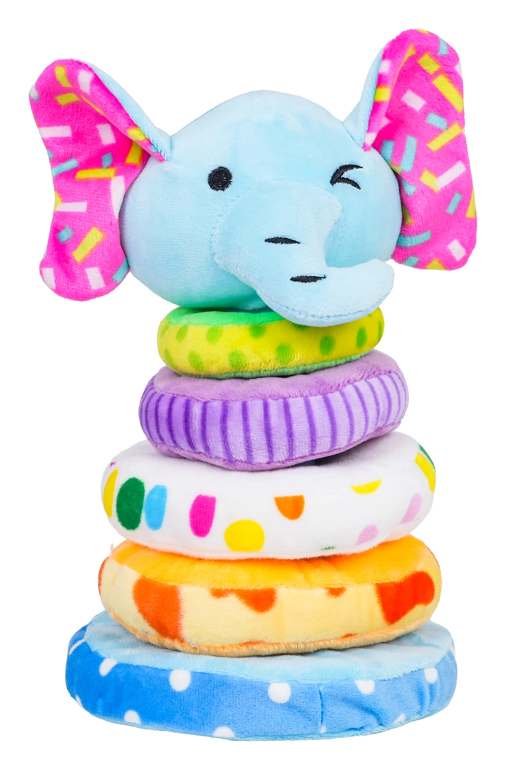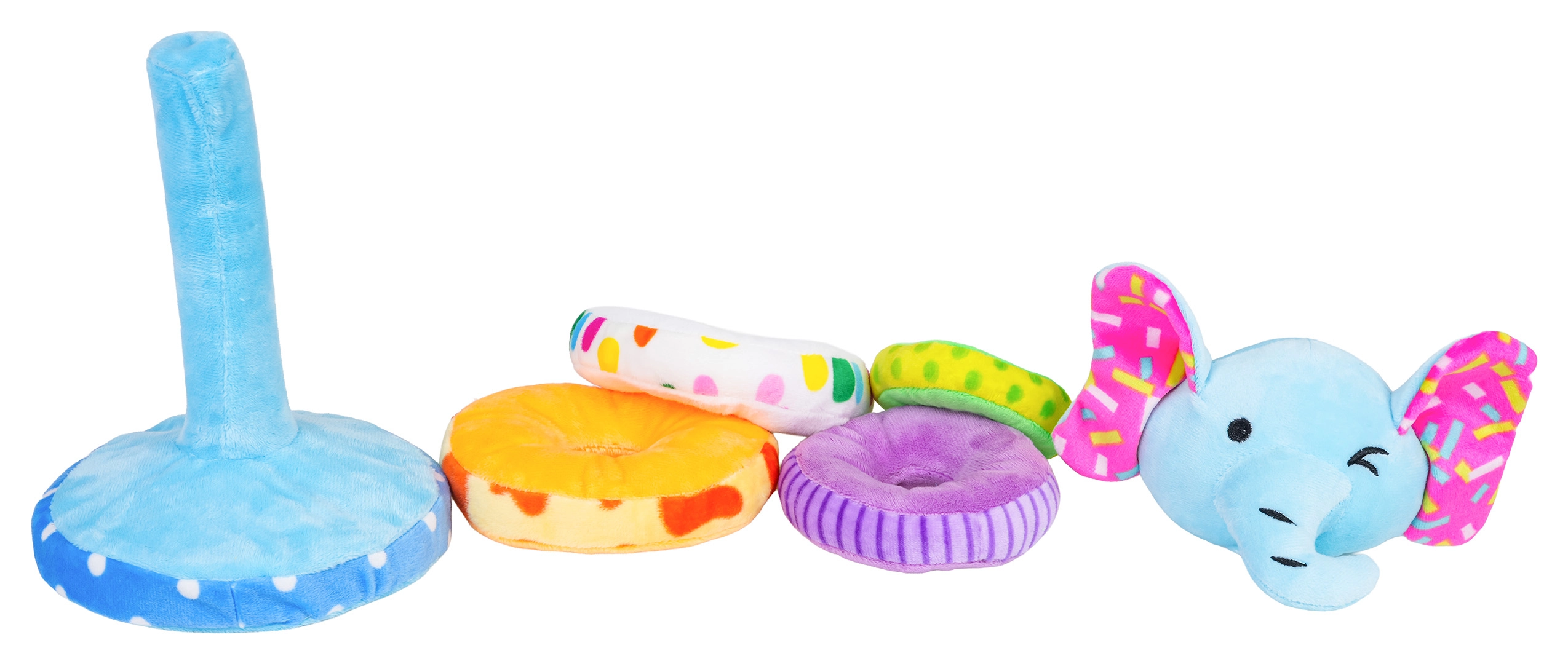 - Contenuto della confezione: base morbida con perno, 4 anelli in peluche, testa dell’elefante rimovibile con squeaker