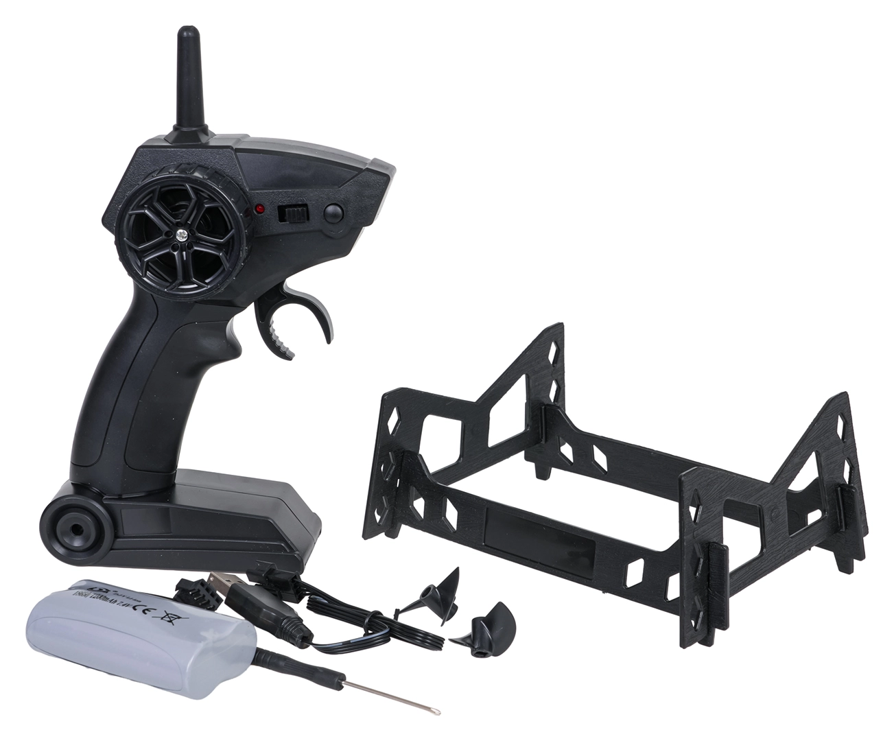 - Barca, telecomando 2,4 GHz, batteria, cavo di ricarica USB, 2× elica di ricambio, cacciavite, supporto per barca, manuale