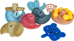 Le palline scorrono fluidamente attraverso più piani mentre i bambini ne seguono il percorso dal canestrino fino alla base di raccolta. Un’ottima attività visuo-motoria.