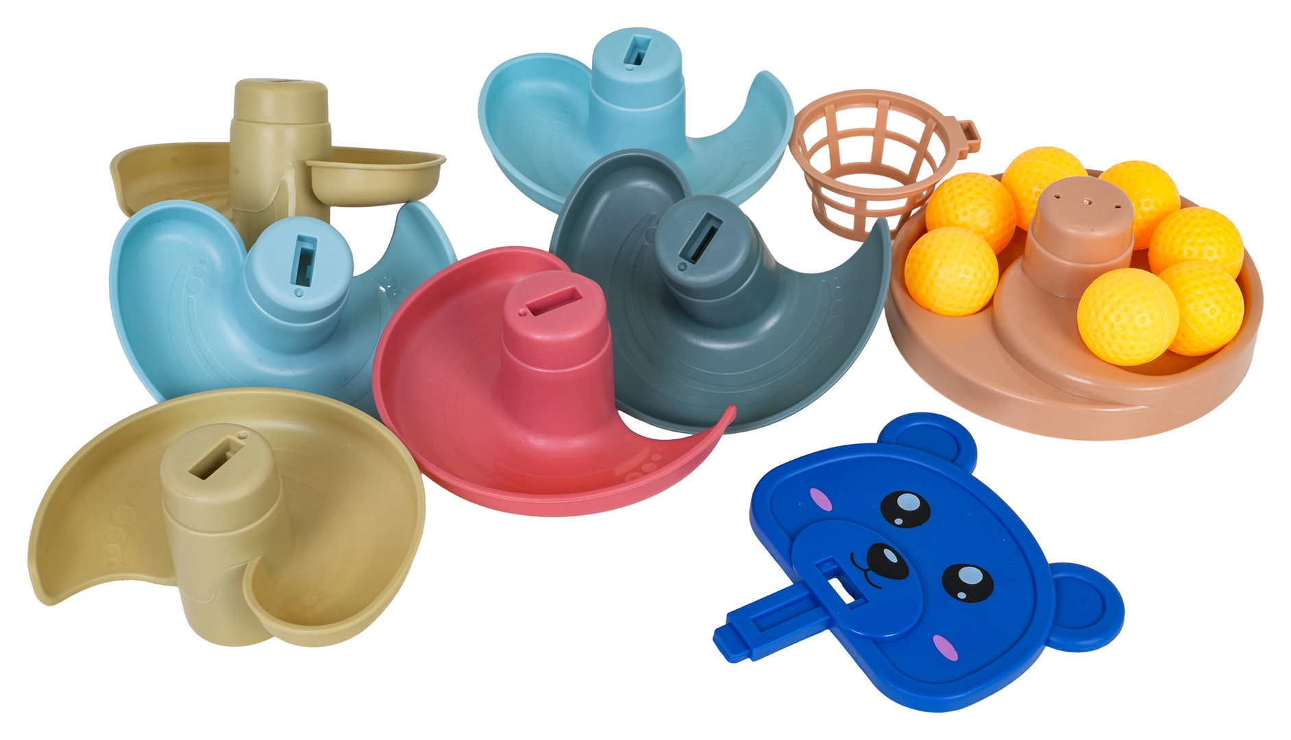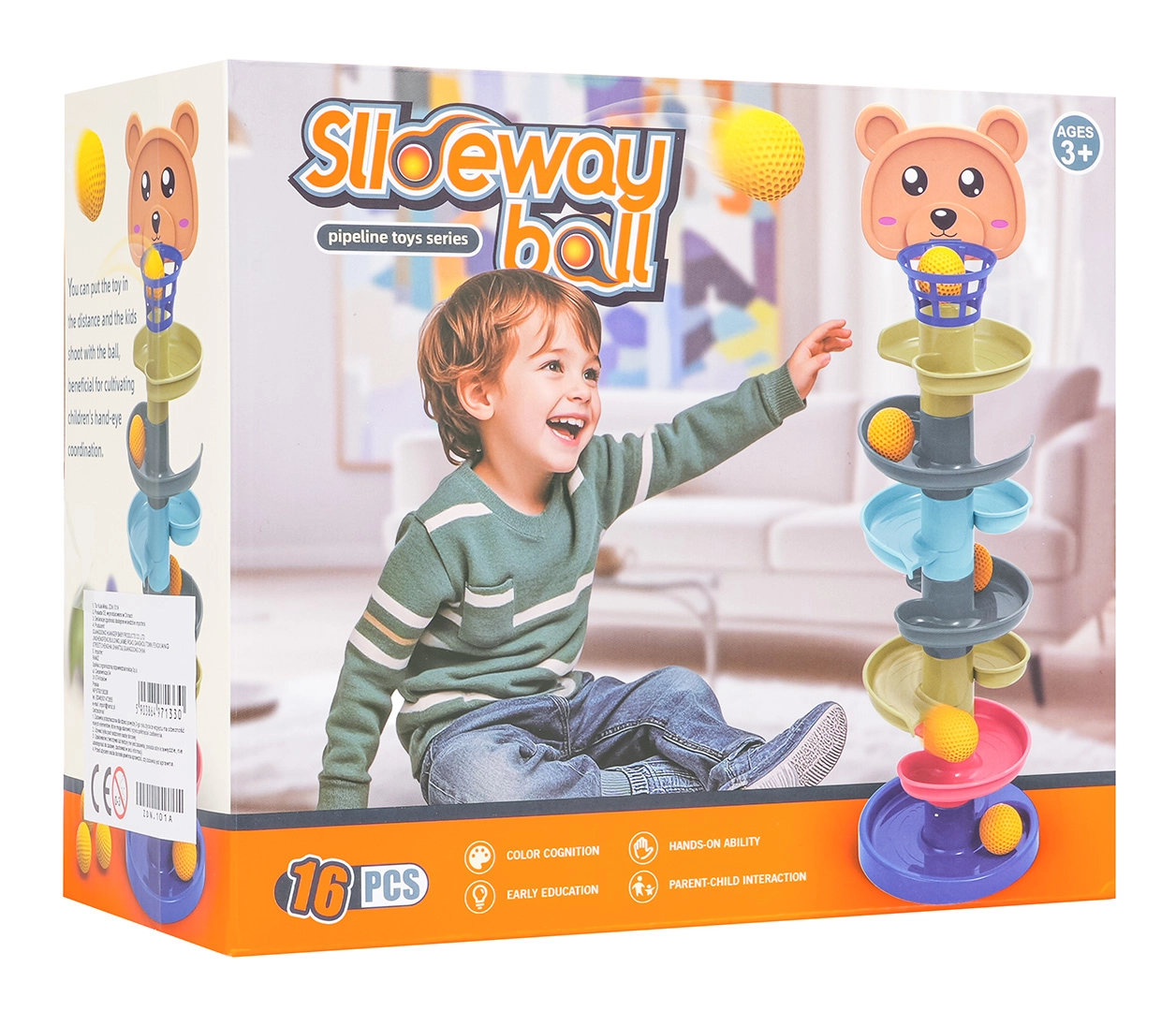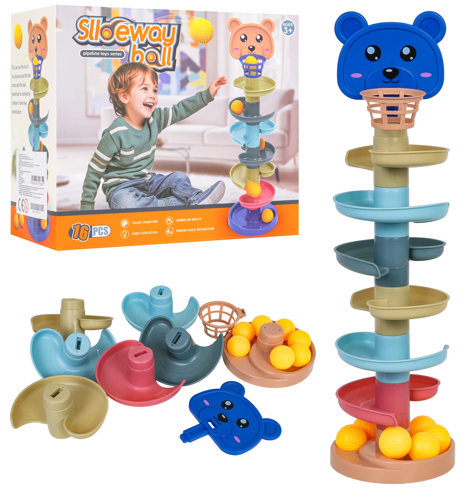 Il set include 16 pezzi: base stabile, 6 piani, testina d’orsetto con canestrino e 7 palline leggere e testurizzate, piacevoli al tatto per i bambini. Il design modulare permette di personalizzare liberamente la pista in base all’età e alle capacità del bambino.