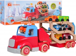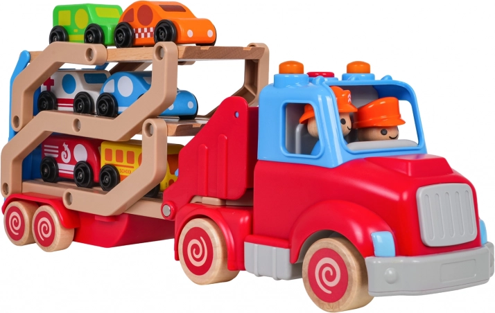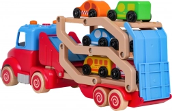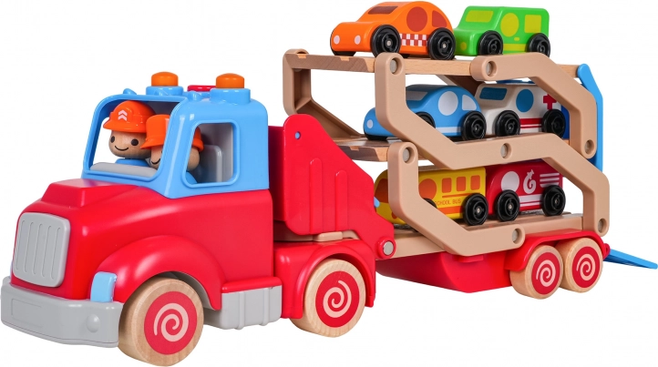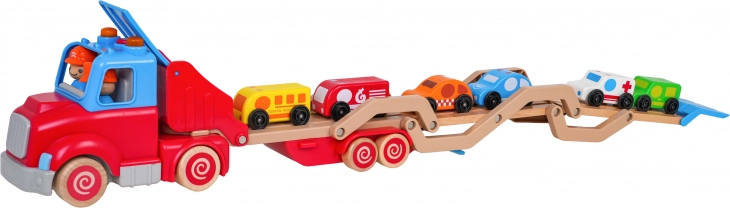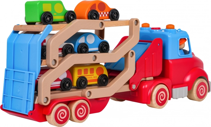 Questo camion in legno con rampa traino sviluppa motricità fine, coordinazione e fantasia. Grazie ai colori vivaci e agli elementi funzionali – rampa sollevabile e ribaltabile, bisarca sganciabile, ruote scorrevoli – i bambini possono caricare e scaricare facilmente le macchinine e inventare le proprie avventure su strada.