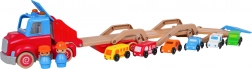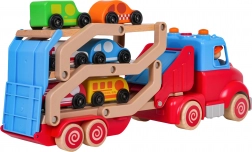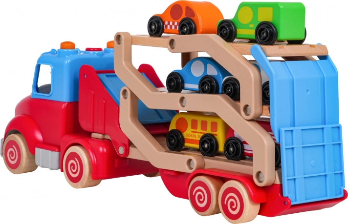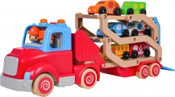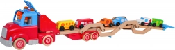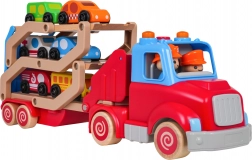 Sul tetto della cabina c’è un pulsante per suoni realistici di avviamento, clacson e melodie, accompagnati da luci lampeggianti. Inclusi 6 veicoli in legno (polizia, taxi, camion dei pompieri, ambulanza, autobus, furgone) e 2 personaggi. L’occhiello anteriore per fissare un cordino permette anche di trainare la bisarca.