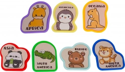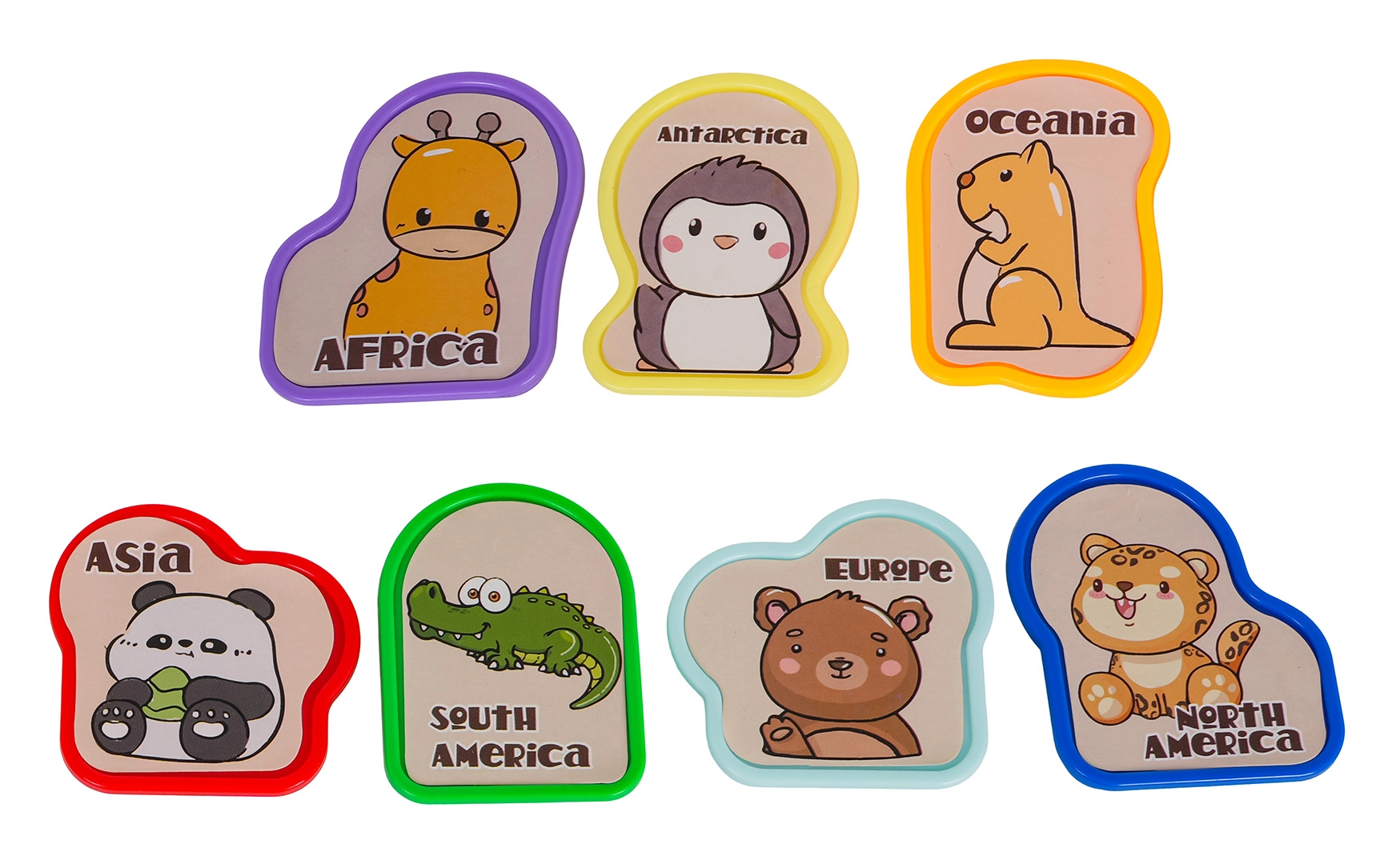 Include 7 continenti e 7 spille con animali. Inserendo la spilla si sente il nome del continente, dell’animale e il suo tipico verso: un apprendimento che diverte.