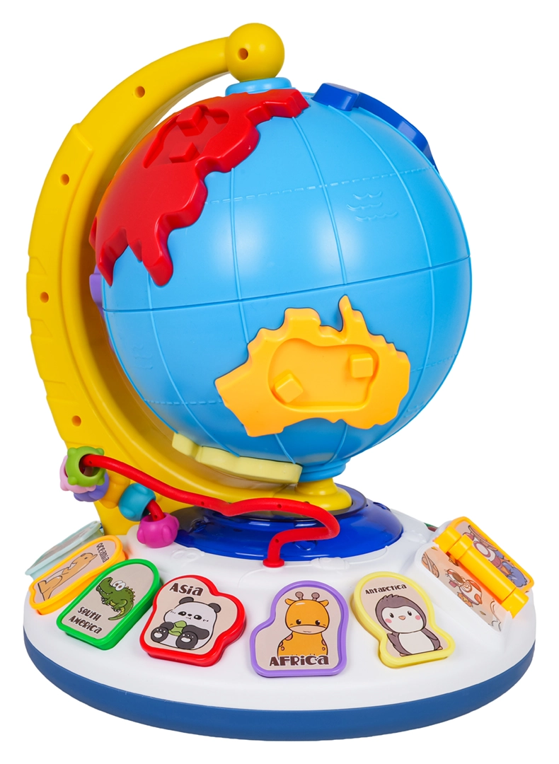 Il globo ruota liberamente su una base stabile. Il libricino a linguetta avvia le melodie e il percorso di perline allena la motricità fine.