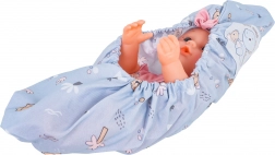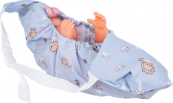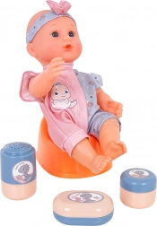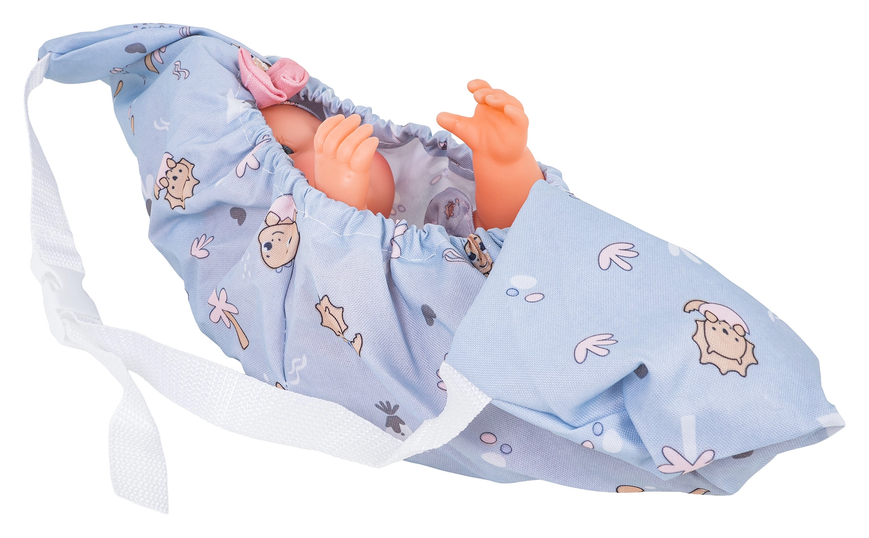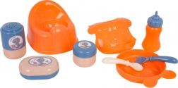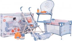 bambola, lettino da viaggio, passeggino, seggiolone, marsupio, vasino, piattino, cucchiaino, forchettina, biberon, vasetto per crema, vasetto per talco, saponetta, bavaglino