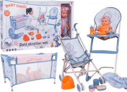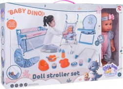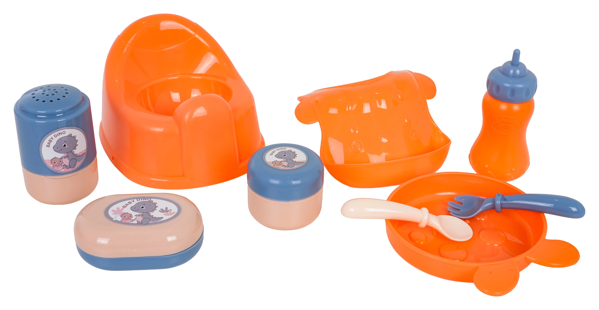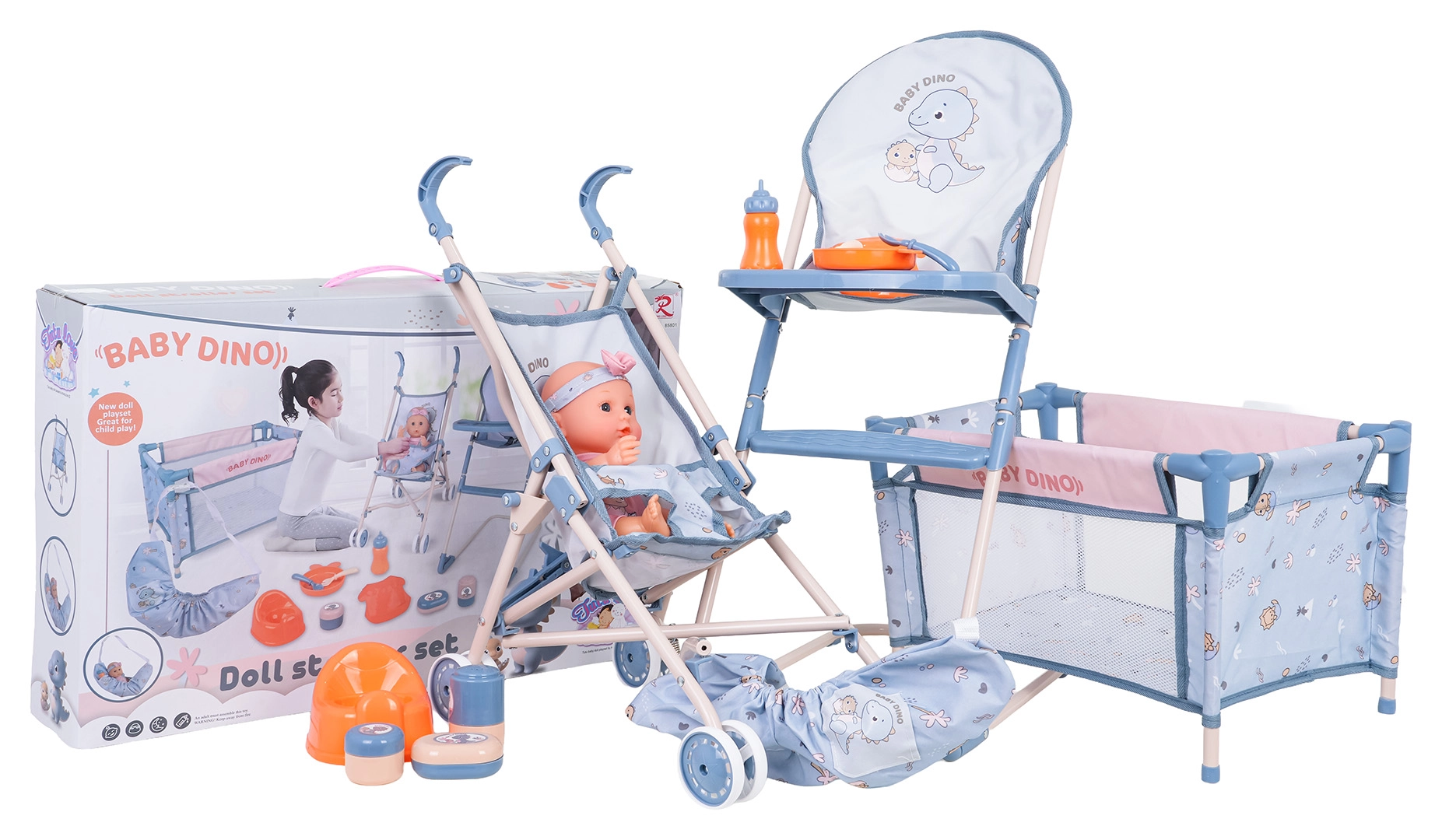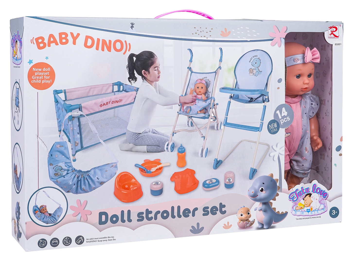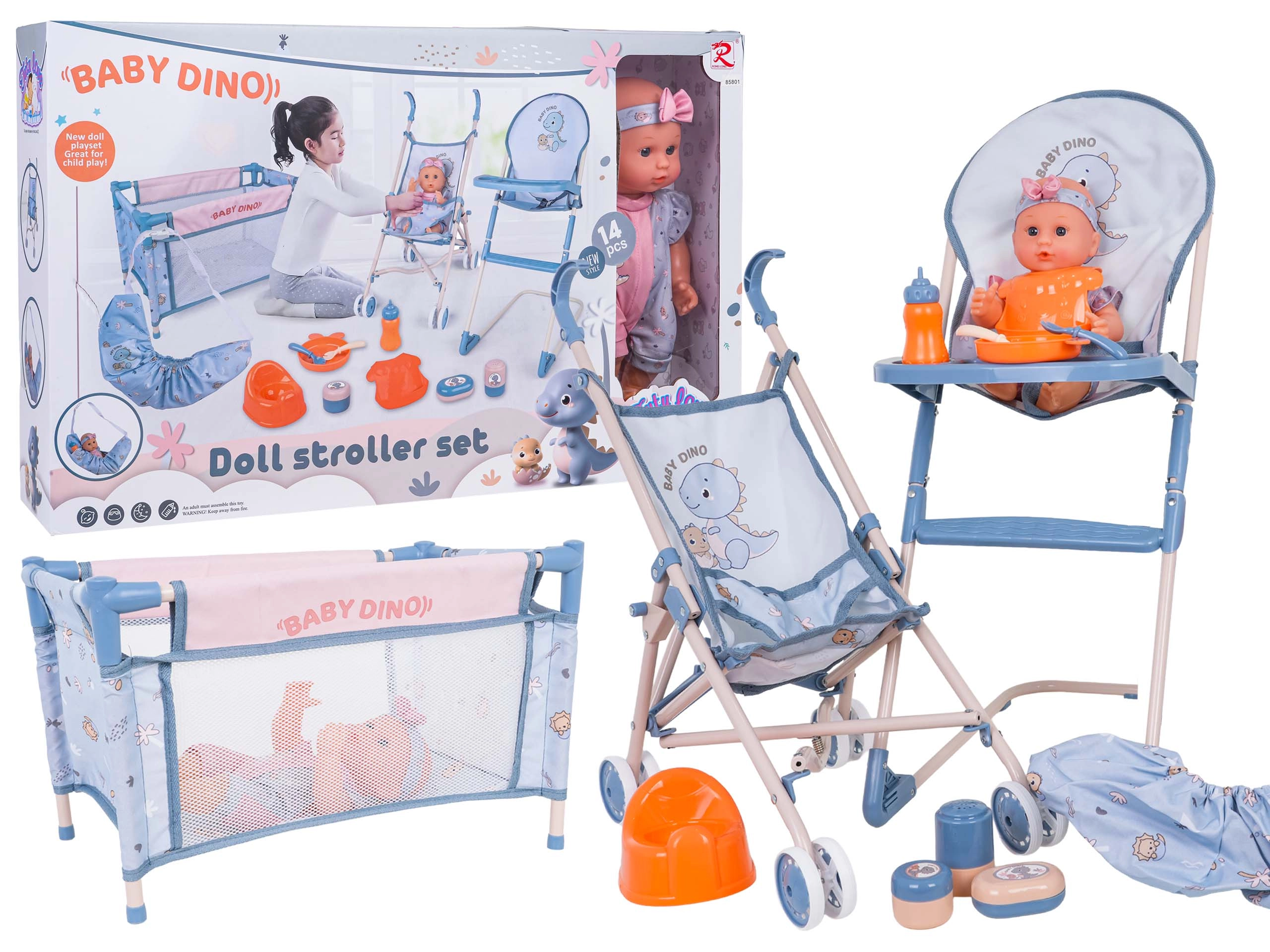Scopri un set riccamente accessoriato per giochi da mamma con la dolce bambola BABY DINO e 14 pezzi di accessori. Include un passeggino, un seggiolone, un lettino da viaggio, un vasino, un biberon e accessori per la pappa. Grazie ai materiali sicuri, ai colori vivaci e alla possibilità di dare da bere alla bambola e insegnarle a usare il vasino, il set è ideale per bambini dai 3 anni.