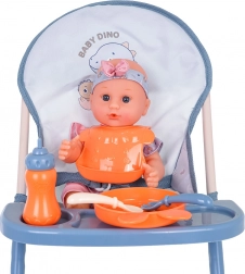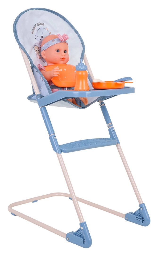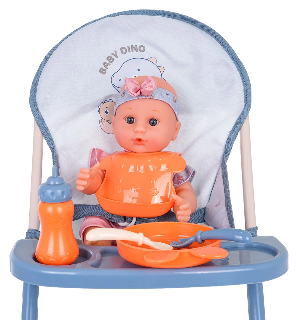 Poppate comode grazie al seggiolone alto con vassoio rimovibile e set di posate, piattino, bavaglino e biberon. Ideale per scenari di cura realistici.