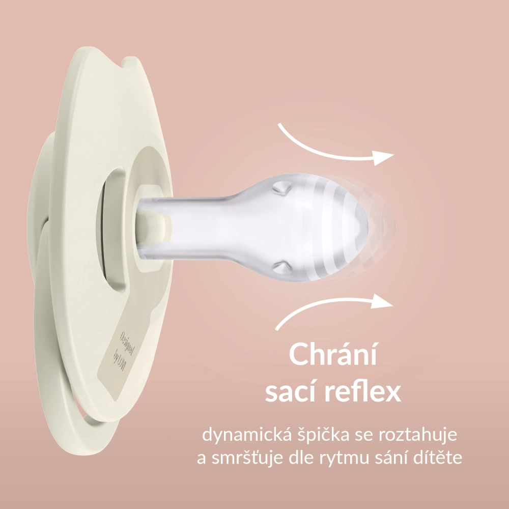 Succhietto in silicone dinamico LOVI PRIME per bambini da 6–18 mesi che protegge il riflesso di suzione, è sicuro per l’allattamento e non interferisce con lo sviluppo dell’occlusione e del linguaggio. La punta simmetrica ispirata alla forma del capezzolo e lo scudo leggero e profilato con fori di ventilazione garantiscono comfort, respirazione nasale libera e minore rischio di irritazione cutanea. Confezione da 2 pz + astuccio per sterilizzazione.