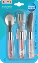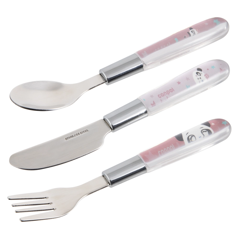 Pratico set di posate metalliche per bambini per mangiare in autonomia, comprende coltello, forchetta e cucchiaio. Grazie alle forme arrotondate è delicato sulle gengive sensibili e sicuro per i bambini. Realizzato in acciaio inox di alta qualità, ideale per bambini dai 18 mesi. Il motivo EXOTIC ANIMALS e la finitura rosa faranno felice ogni piccola commensale.
