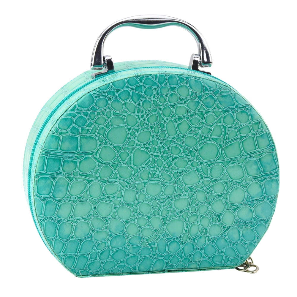 Pochette cosmetica rotonda turchese con manico metallico e zip, mantiene tutti gli accessori al sicuro e sempre a portata di mano – perfetta a casa e in viaggio.