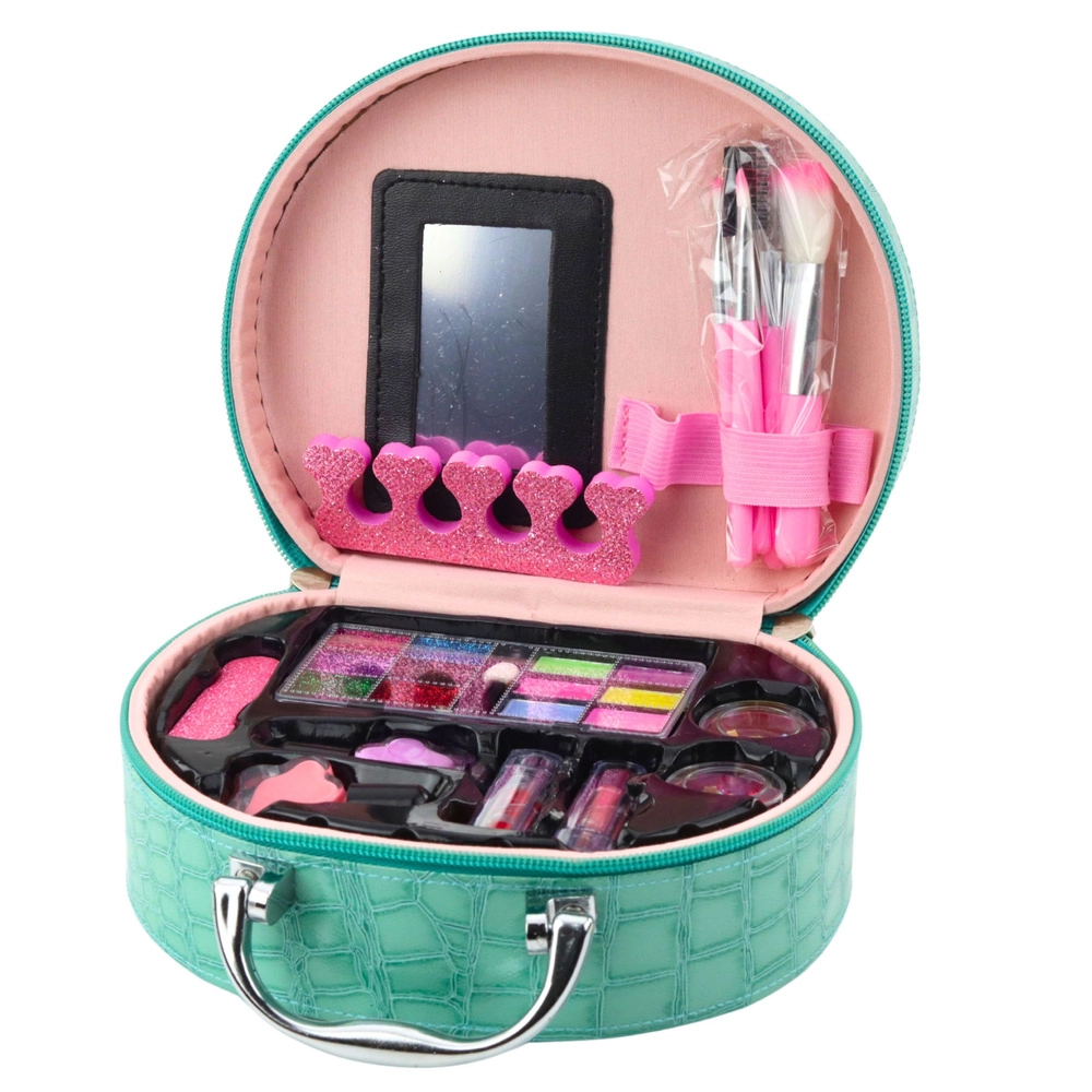 Questo bellissimo set cosmetico per bambini stimola fantasia e motricità fine. Tutto è ordinatamente organizzato nella pochette rotonda richiudibile con manico, facile da trasportare e da tenere in ordine. Perfetto per il divertimento a casa, feste di compleanno e incontri con le amiche.
