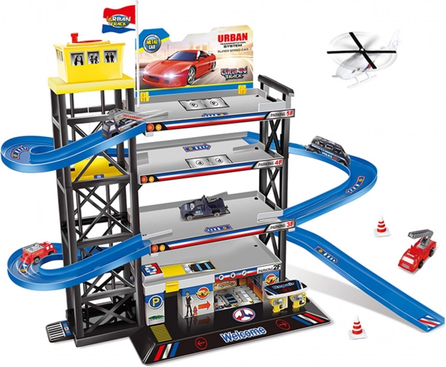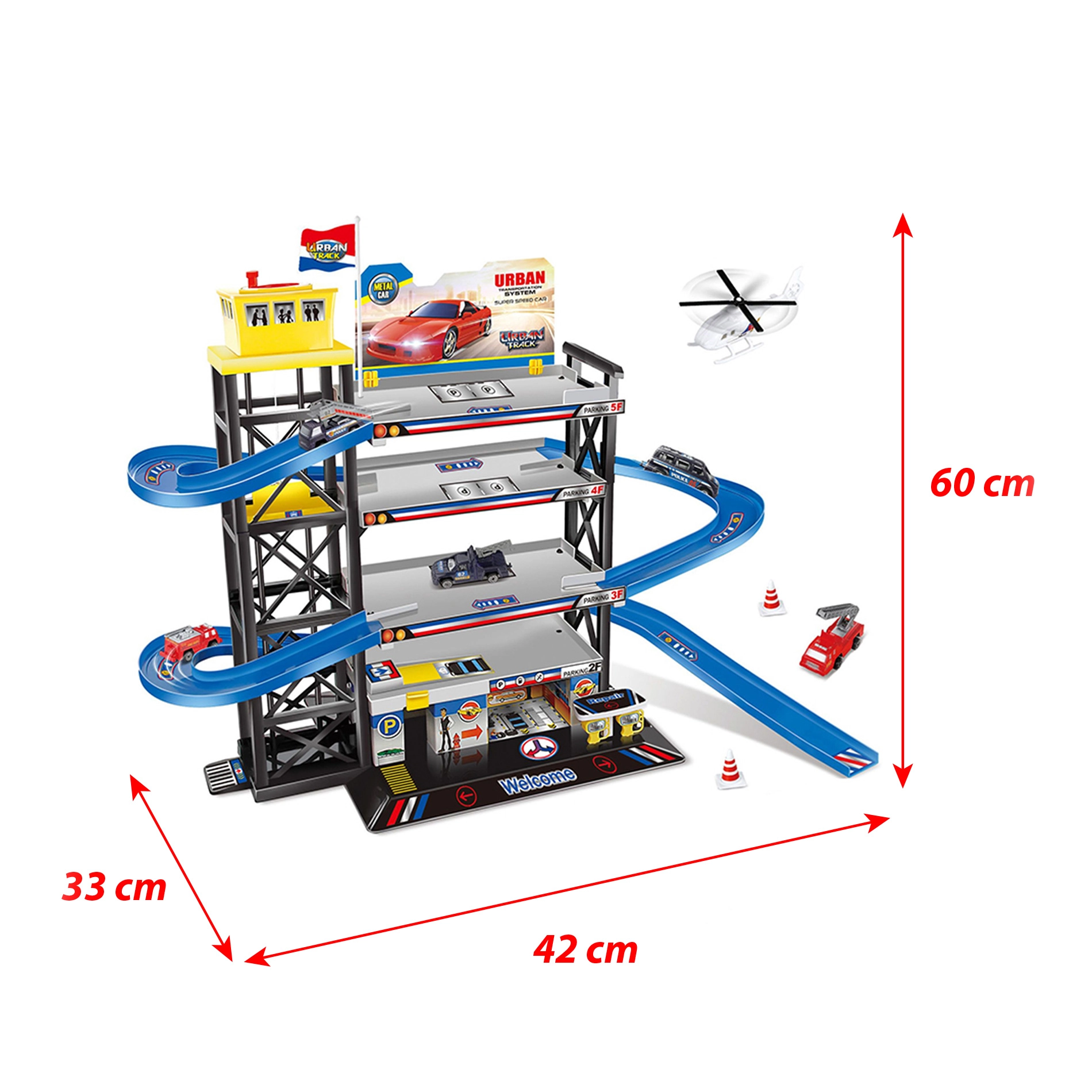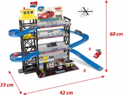 Organizza il tuo parco auto in un pratico garage a quattro piani con eliporto! Inclusi 4 piani, elicottero e 3 macchinine in metallo lunghe circa 7–8 cm. Una volta assemblato, il garage misura 42 × 60 × 33 cm ed è adatto a bambini dai 4 anni. Non è possibile scegliere varianti specifiche. Avvertenza: il prodotto è confezionato in imballo sostitutivo.