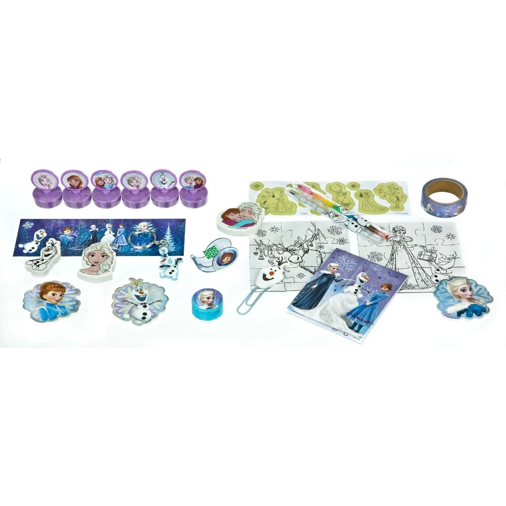 All’interno troverai una selezione colorata di accessori e articoli per la scuola – da mini timbri e adesivi fino a un taccuino o gomme sagomate. Tutto coordinato con l’atmosfera invernale di FROZEN, per rendere ogni giorno dell’Avvento davvero magico.