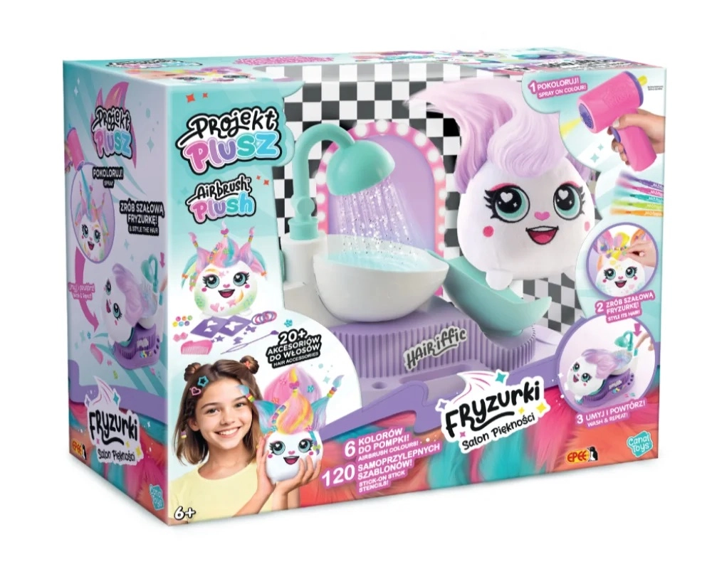 Il set creativo Epee Projekt Plusz Fryzurki – Salone di bellezza offre ai bambini tutto il necessario per decorare e acconciare il loro peluche. Con l'aerografo elettronico a forma di phon e gli stencil, applicano facilmente motivi colorati che possono essere completamente modificati dopo il lavaggio, per creare ancora e ancora. La stazione di lavaggio con getto d'acqua aggiunge realismo al gioco e insegna ai bambini a prendersi cura della propria creazione.