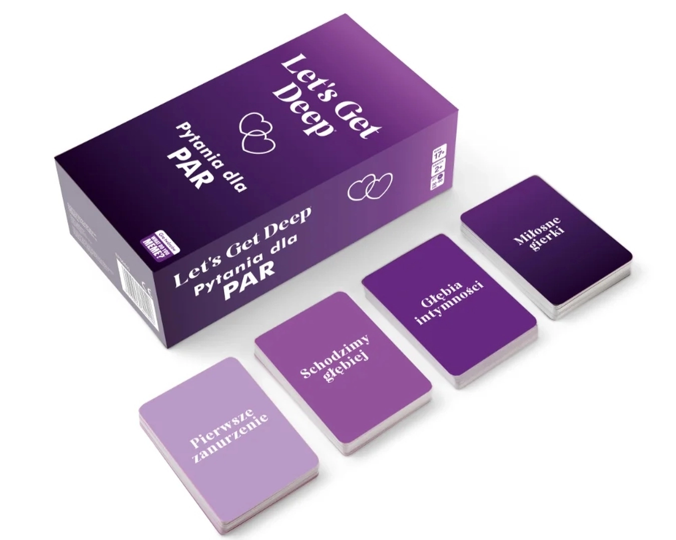 Il gioco Let's Get Deep è la scelta ideale per le coppie che vogliono ravvivare i momenti insieme e, allo stesso tempo, conoscersi meglio. Le carte sono suddivise in quattro categorie – Primo Tuffo, Andiamo Più a Fondo, Profondità dell'Intimità e Giochi d'Amore – e vi guidano progressivamente da temi leggeri a domande più intime.