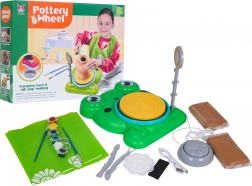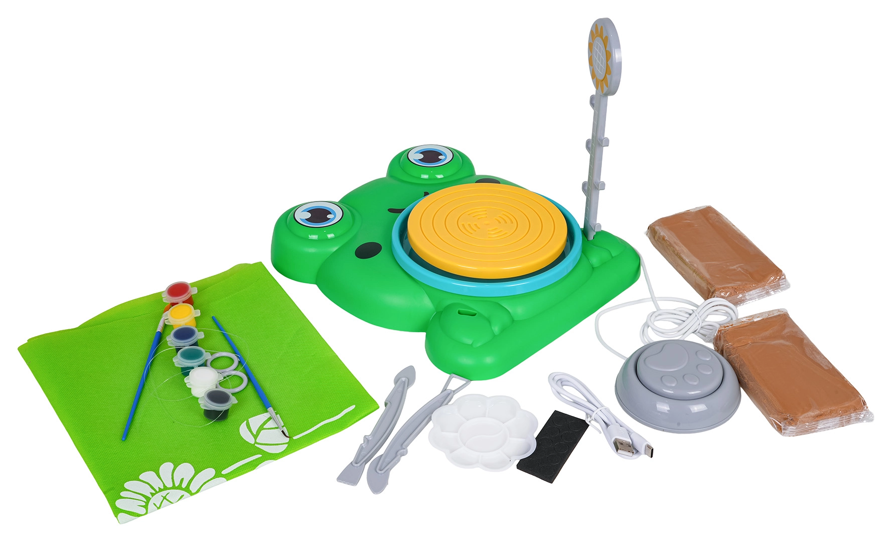 Base a forma di rana, piatto rotante, pedale a piede, lampadina, utensili, colori e 2× argilla: tutto per creare e dipingere subito.