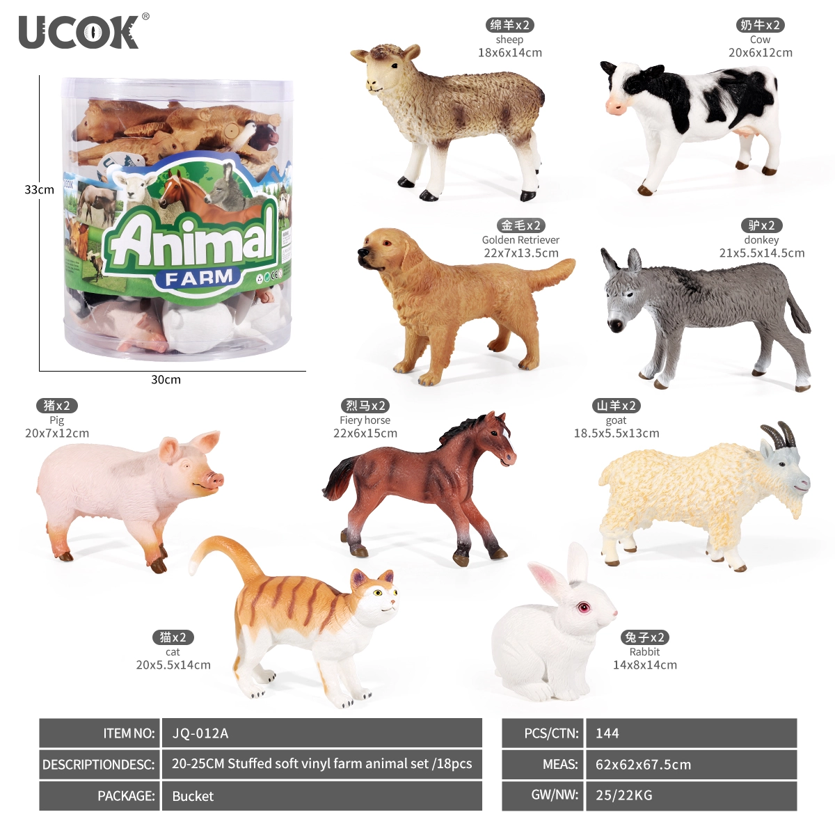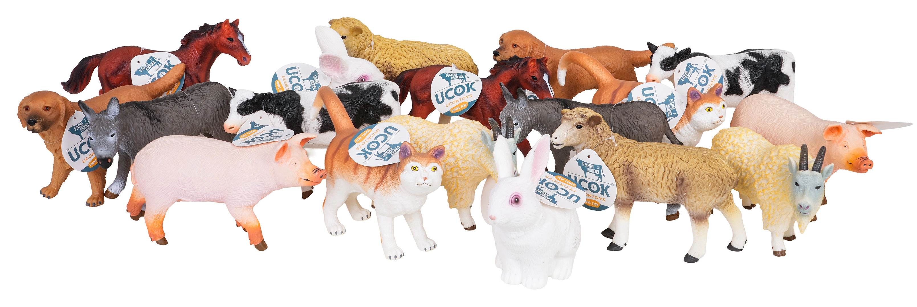 Nella confezione trovi una selezione varia di animali da fattoria tra cui cavallo, mucca, maiale, capra, pecora, asino, cane, gatto e coniglio – sempre in due esemplari, così i bambini possono giocare facilmente in coppia o creare un piccolo “gregge”. Il tubo/box pratico consente di mantenere ordine e facile trasporto, rendendo il set adatto a casa, all’asilo e in viaggio.