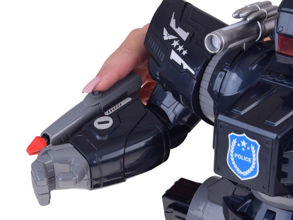 Gambe massicce e piedi larghi per una camminata stabile, dettagli POLICE, distintivi e barra luminosa sulla spalla. Braccia mobili per impostare pose dinamiche.