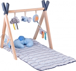 La stilosa baby gym in legno offre al neonato uno spazio confortevole sia a pancia in giù sia sulla schiena, mentre i morbidi giochi sospesi invitano ad allungarsi, afferrare ed esplorare diverse texture. Elementi a contrasto, materiali fruscianti e squeaker stimolano naturalmente vista, udito e tatto.