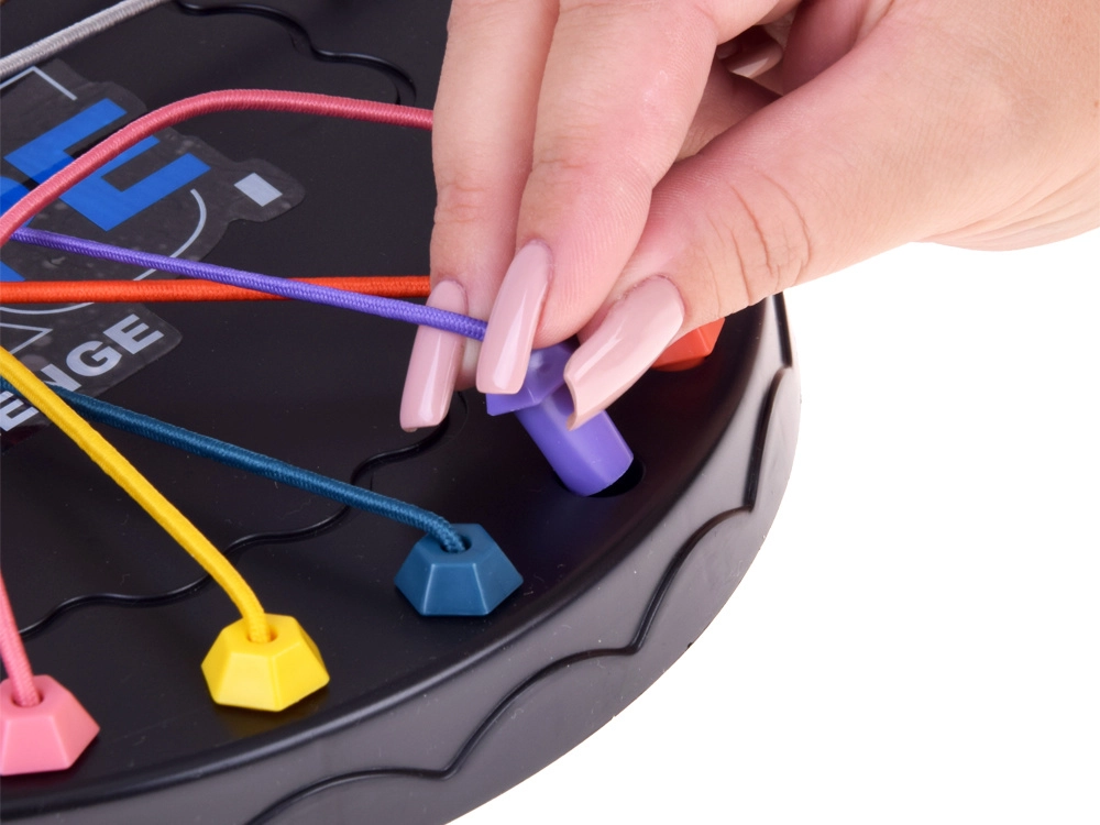 - Come si gioca: scegli il colore dei piolini, fissa i cordini e crea un modello; poi trova la procedura per allentare i cordini nell’ordine corretto, in modo da poterli rimuovere tutti gradualmente.