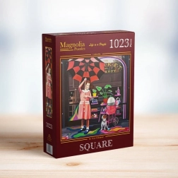 Elegante puzzle con motivo di magnolia e ombrello, composto da 1023 pezzi per un assemblaggio rilassante. Una volta completato, crea un quadro quadrato 60 × 60 cm, ideale da incorniciare e per una decorazione d’interni elegante.