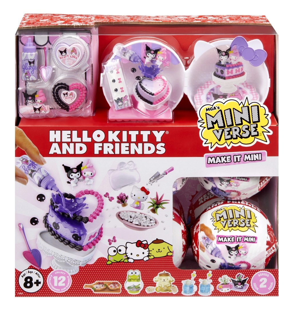Scopri il mondo delle prelibatezze in miniatura con il set MINIVERSE Make It Mini Hello Kitty e amici – serie 2. In ogni sorpresa assemblerai un delizioso mini cibo o bevanda ispirato a HELLO KITTY e alla sua squadra, che una volta indurito al sole diventa una stilosa decorazione da collezione. Ti aspettano dettagli realistici, assemblaggio facile e 12 ricette da scoprire.