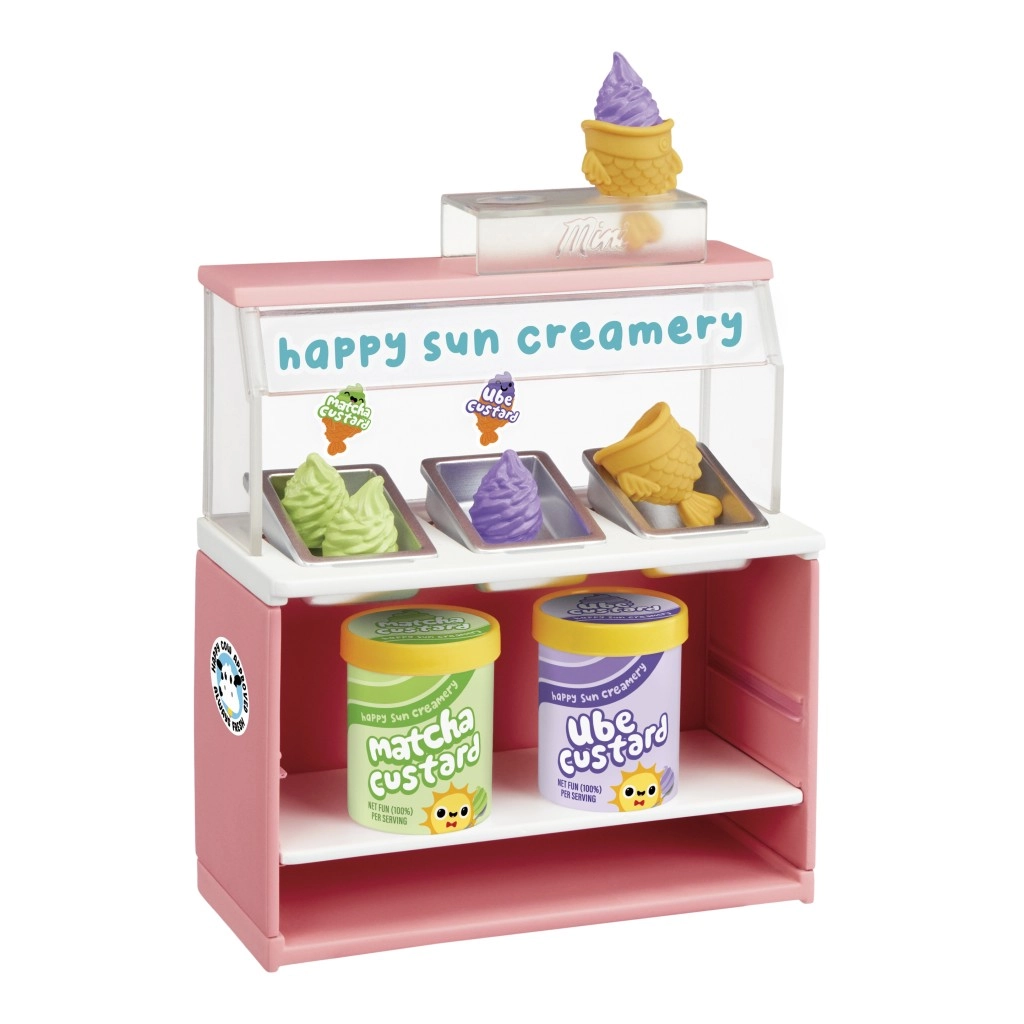 Vetrina, coni e vaschette con gusti come Matcha e Ube donano alla tua mini-scenetta uno stile dolcissimo. Ideale per gli appassionati di mini-cibi e di composizioni creative.