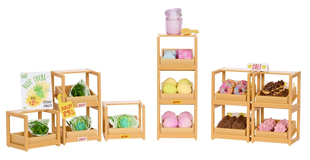 - Accessori dettagliati – mini palline di gelato, prodotti da forno, verdure, cartelli “SALE/NEW” e altro.