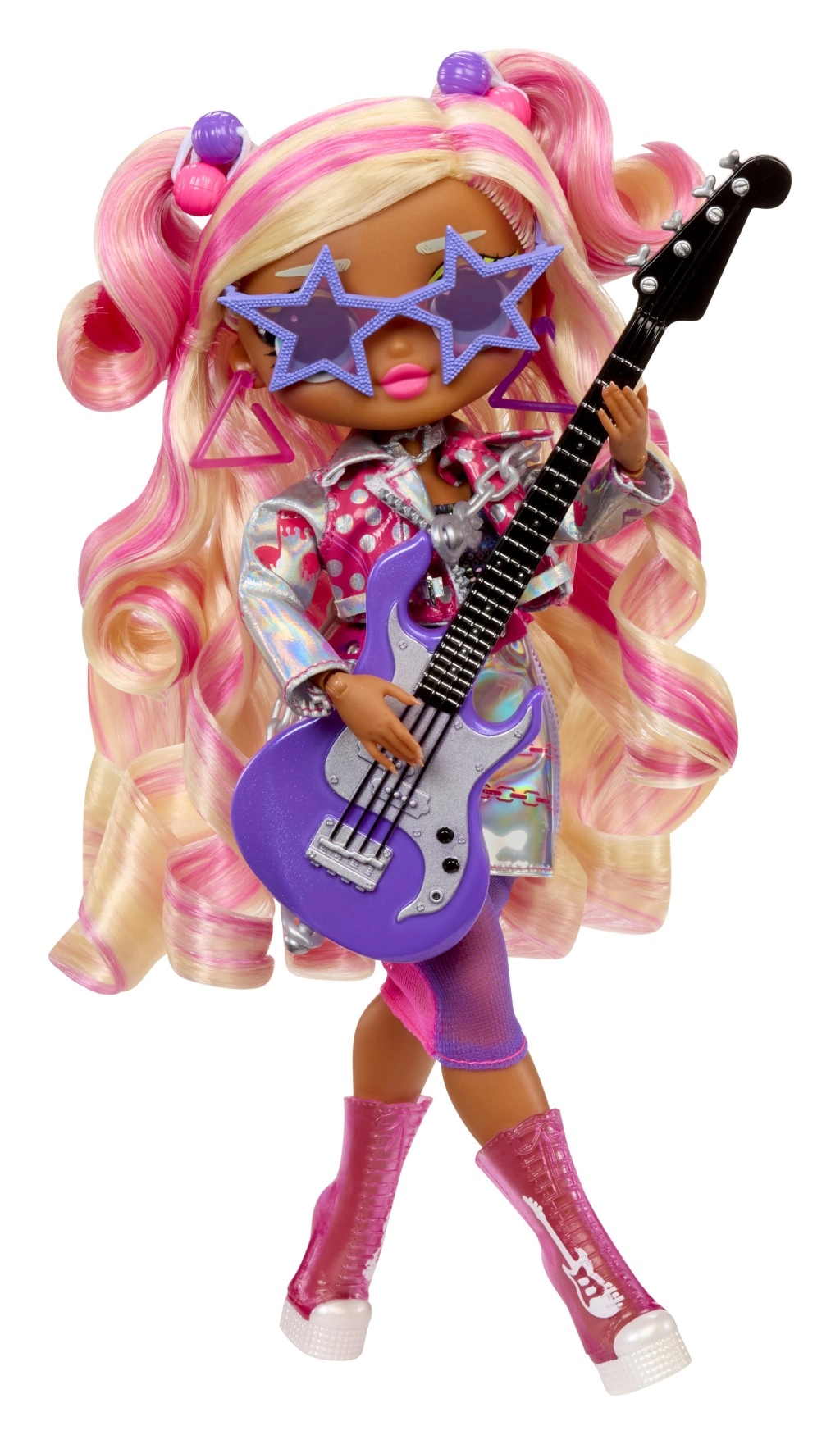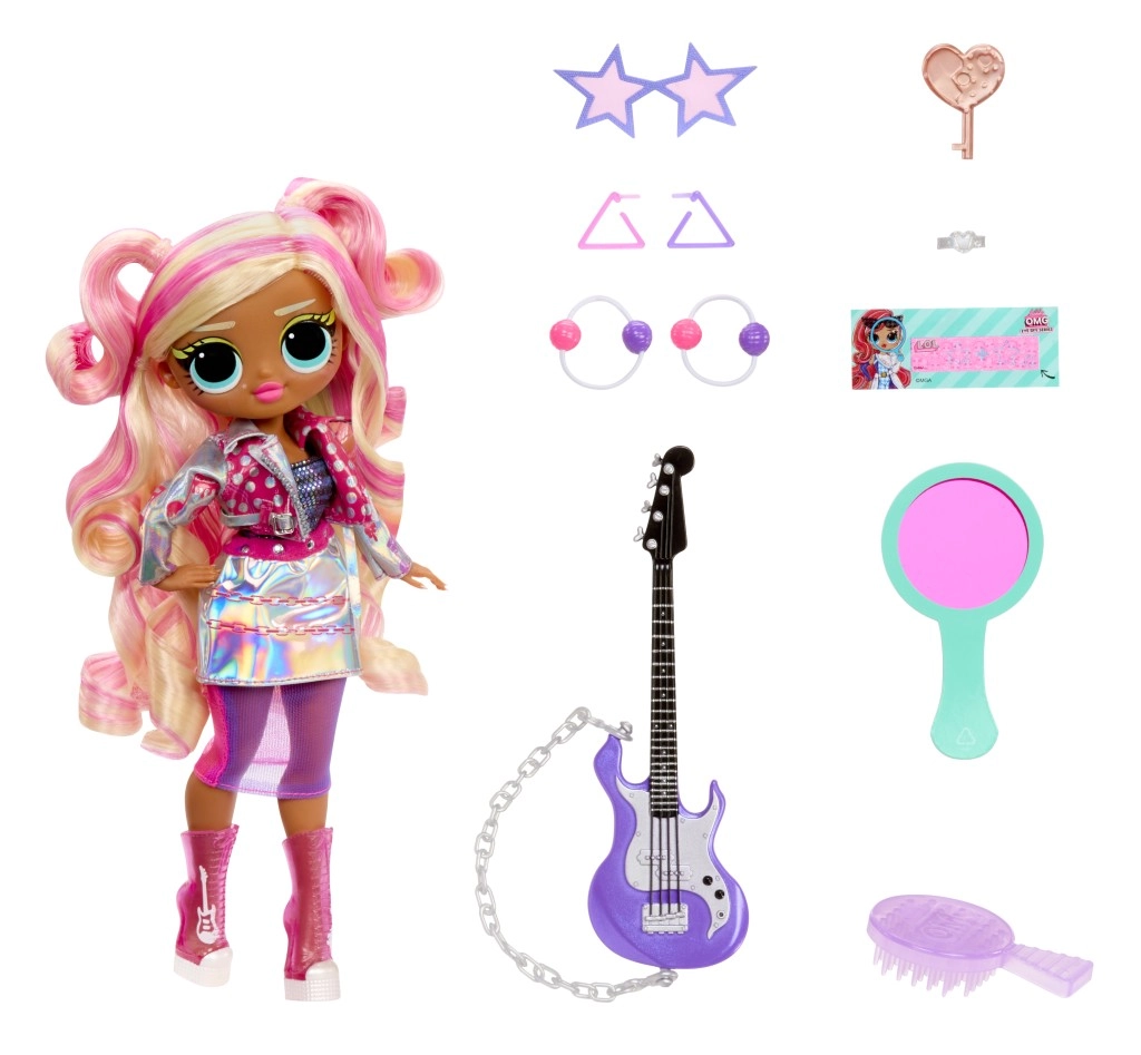 Vivi un unboxing pieno di suspense con la L.O.L. Surprise! O.M.G. Grande Sorella Rockstar. Ti aspettano 15+ sorprese, codici da decifrare, cambio di look con l’acqua fredda e due outfit in uno per infinite combinazioni di stile. Inclusi chitarra, accessori fashion, spazzola per capelli e supporto per mettere in posa la bambola.