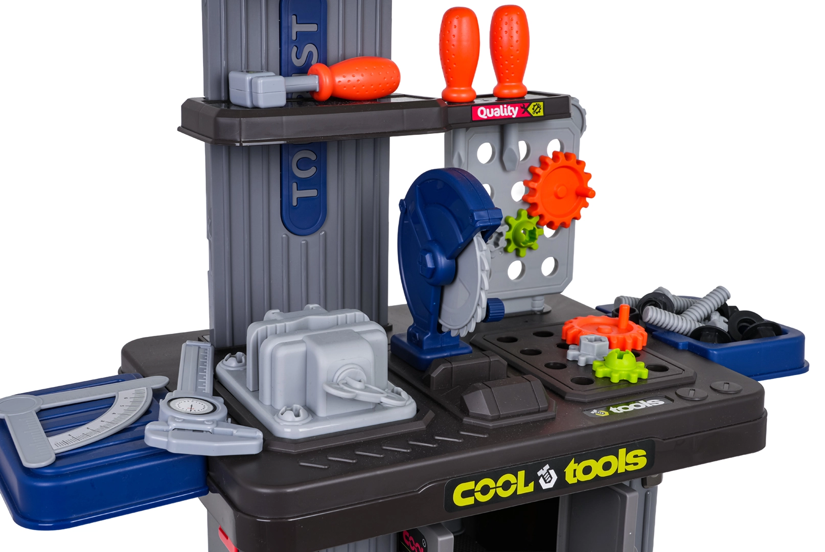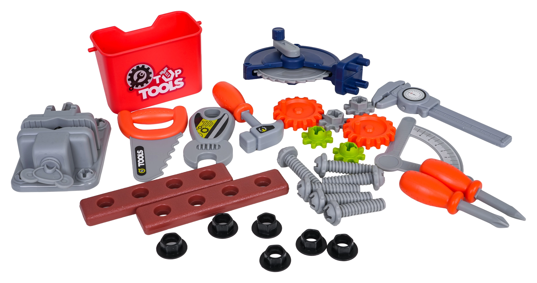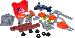 - 2× valigetta, parti per assemblare il banco, box per utensili, morsa, 6× ingranaggio, sega, 2× elemento per avvitare, calibro a corsoio, 3× bussola, inserti a taglio e a croce, inserto con “martelletto”, goniometro regolabile, chiave regolabile, 6× vite, 6× dado/elemento di innesto, adesivi decorativi