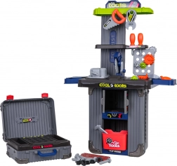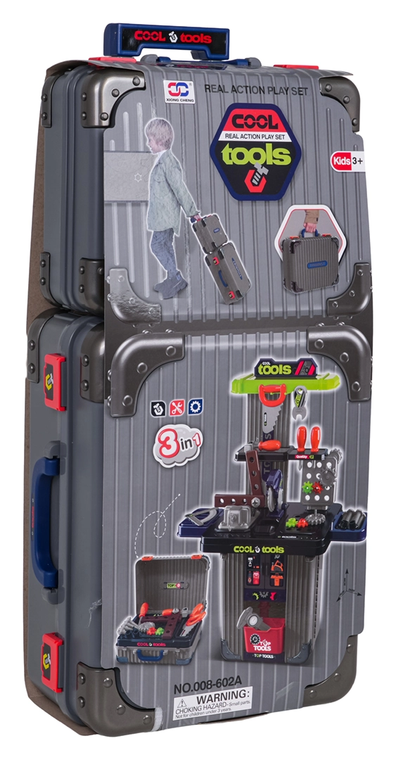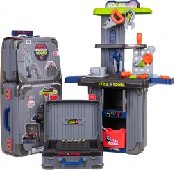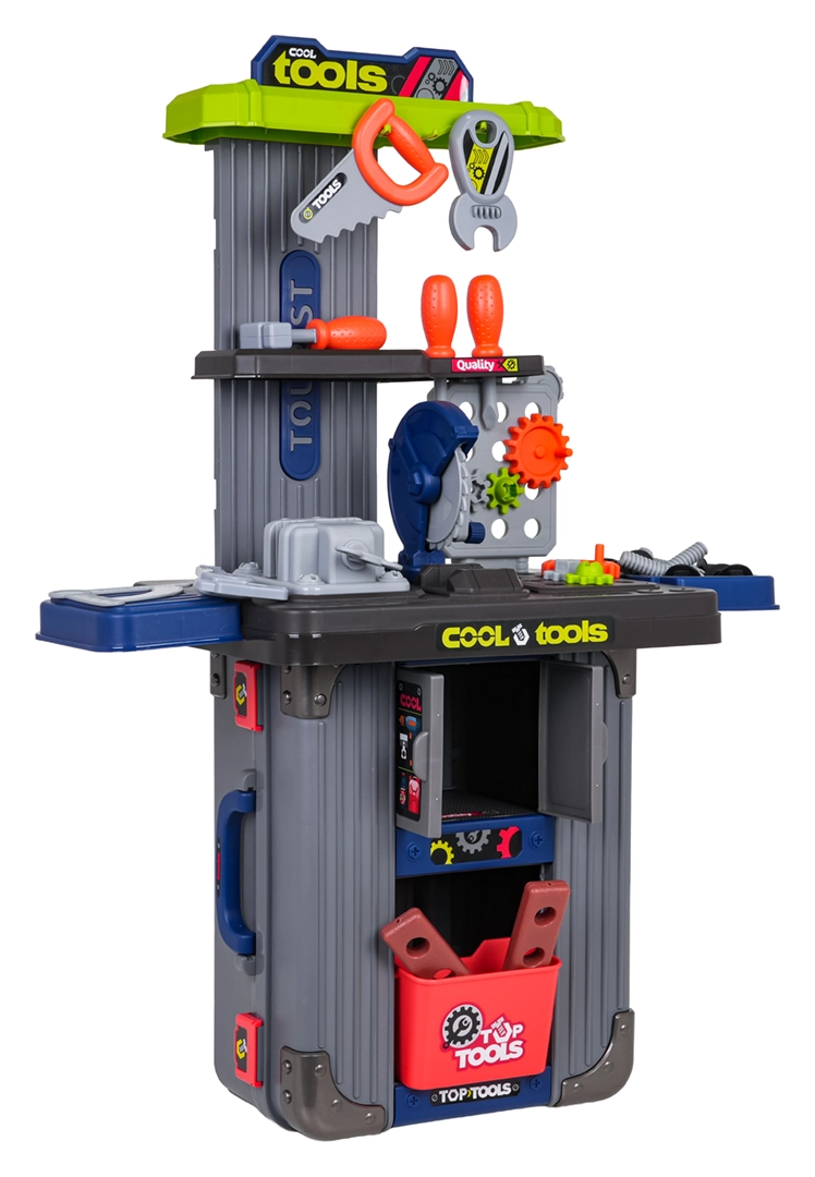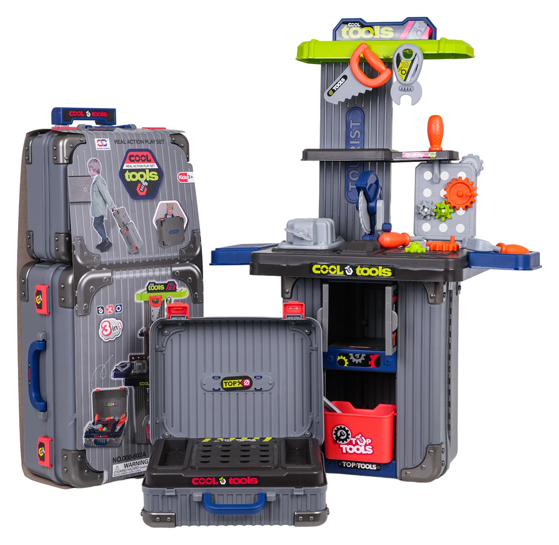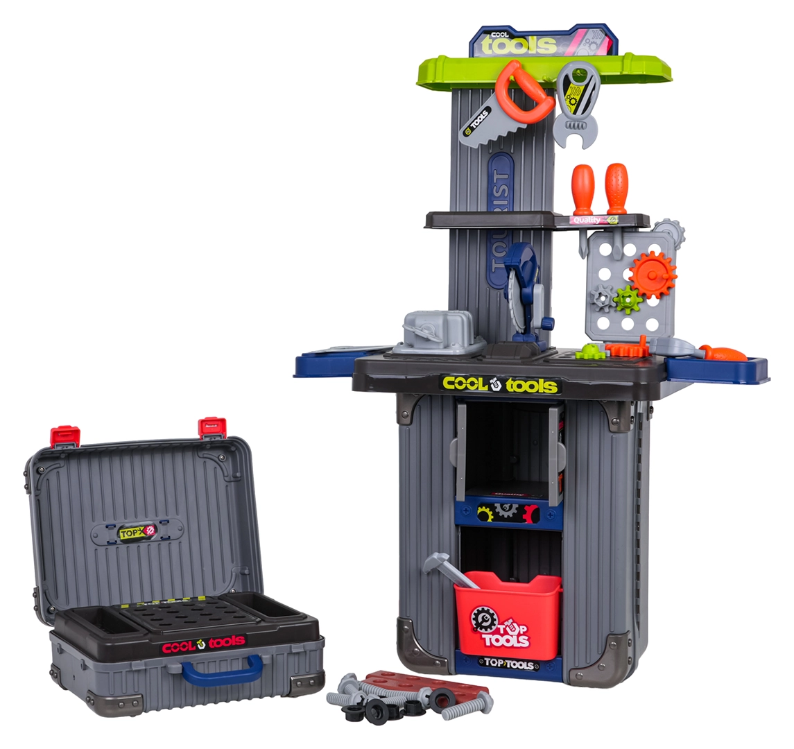 Set da officina portatile per bambini 3 in 1 che si trasforma da valigette in un banco da lavoro stabile. Offre ricchi accessori, robusta realizzazione in plastica e infinite possibilità di gioco creativo per bambini dai 3 anni. Nel set trovi morsa, sega, viti, cacciaviti, chiavi, ingranaggi e altri accessori – tutto ordinatamente riposto in pratiche valigette con ruote.