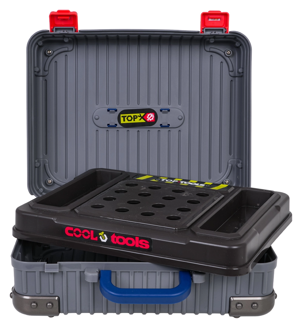 Questo intelligente set 3 in 1 combina due valigette e un ricco assortimento di utensili in un unico mondo di lavoro portatile. I bambini assemblano facilmente il proprio banco da lavoro con morsa, ripiani e pannello forato e, dopo il gioco, ripongono tutto nelle valigette mobili. La plastica di qualità resiste all’uso intensivo e garantisce una lunga durata.