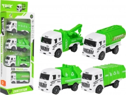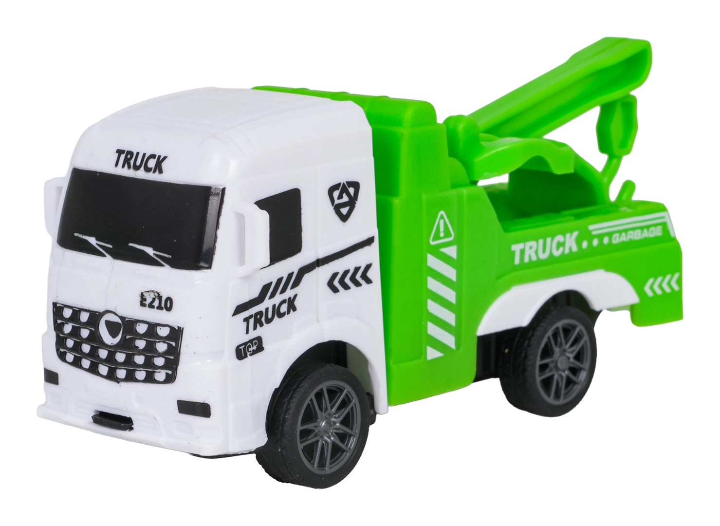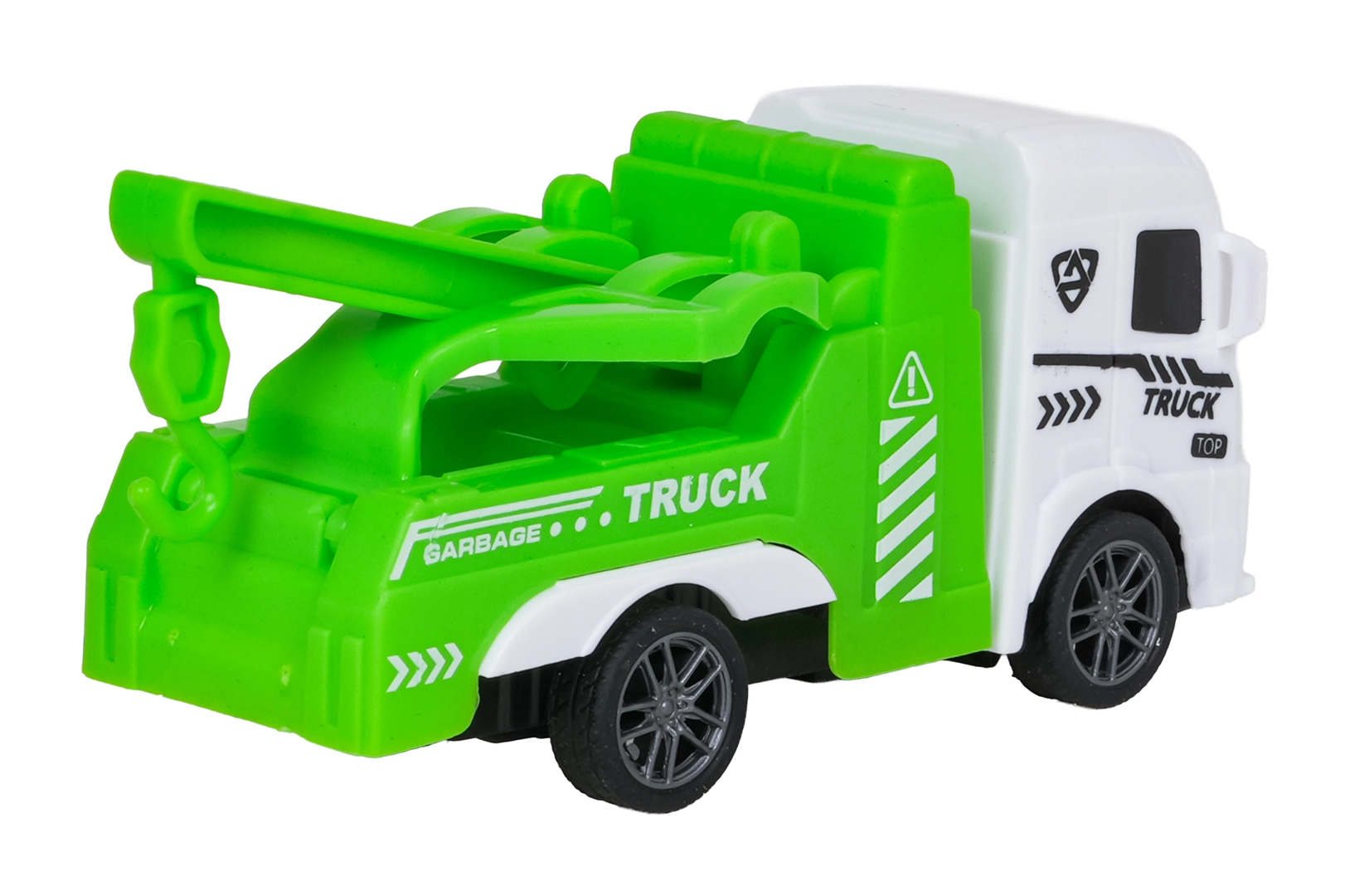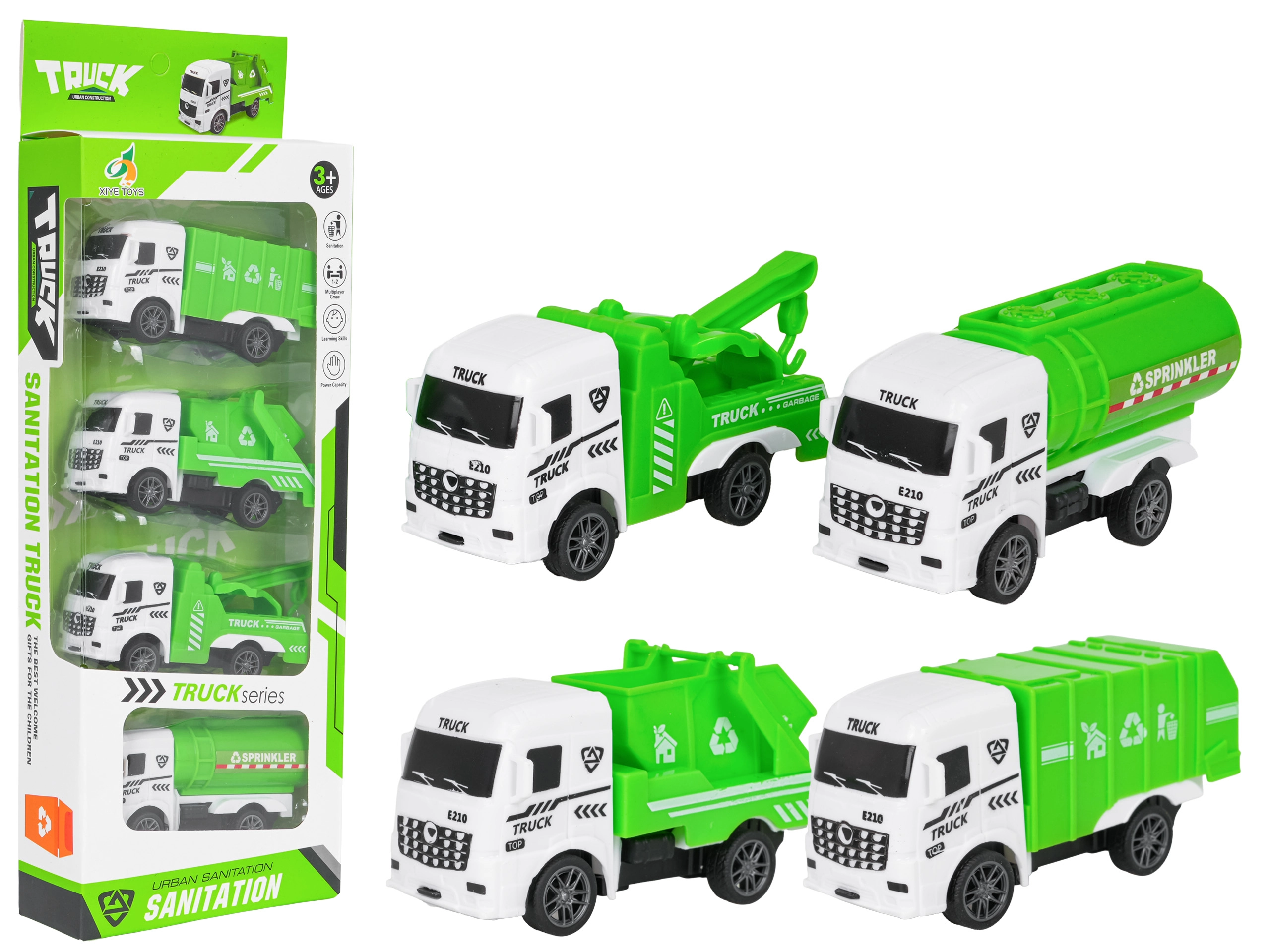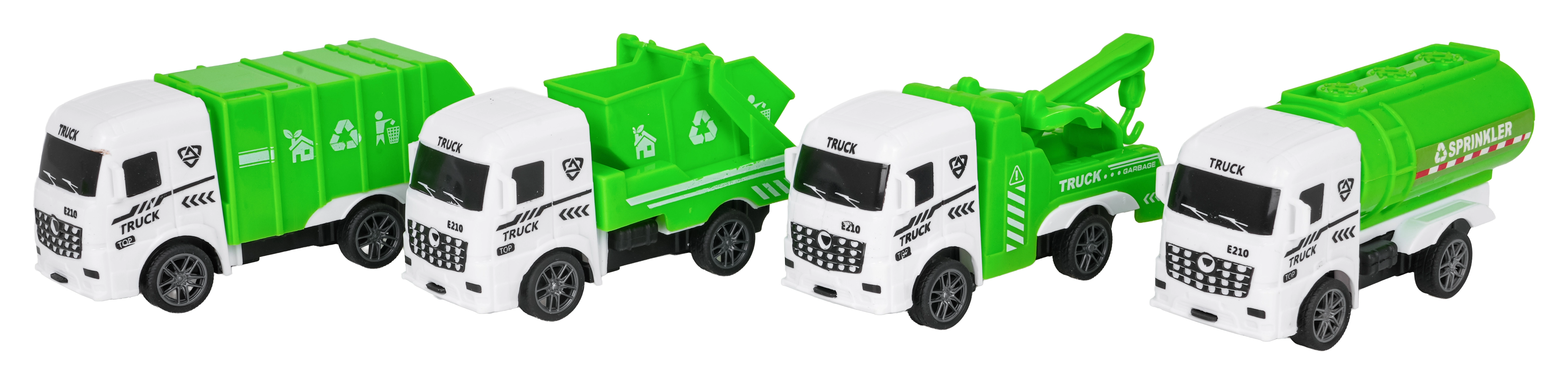 Camion della spazzatura, ribaltabile, carro attrezzi e autocisterna/spruzzatrice: una squadra completa per pulizia, manutenzione e soccorso nelle strade della città.