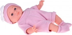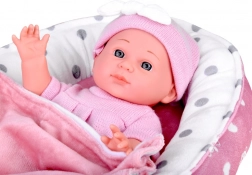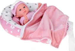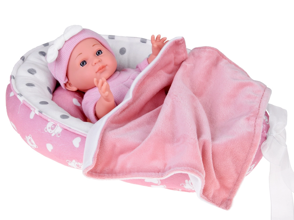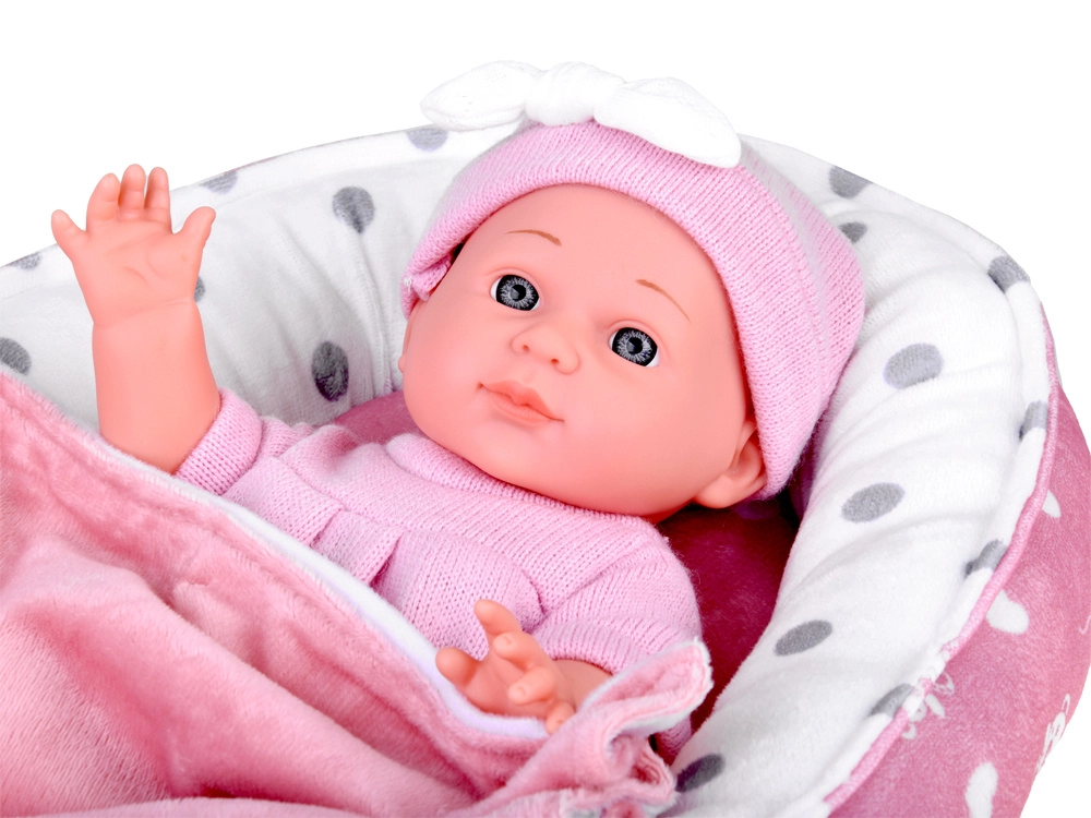 Dolcissimo bebè in abitino rosa con morbido nido, cuscinetto e copertina, che offre ai bambini un gioco realistico di cura. Inclusi anche biberon e ciuccio; la bambola ha arti snodati e vestitini facilmente rimovibili in delicate tonalità pastello.