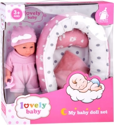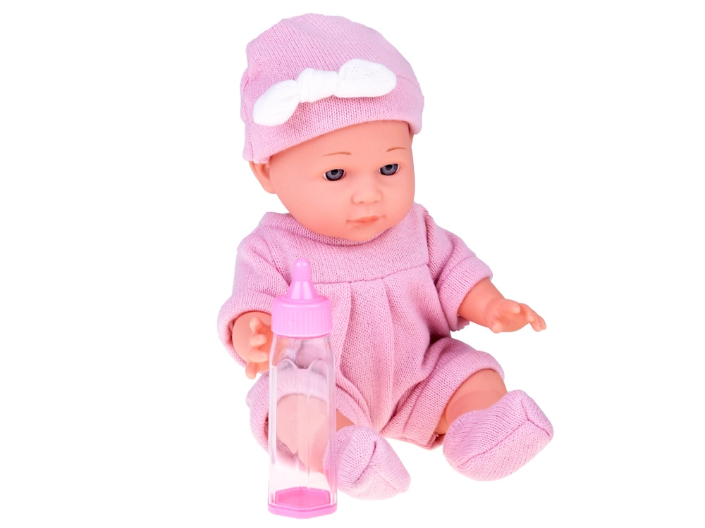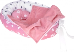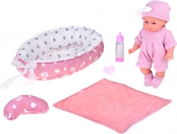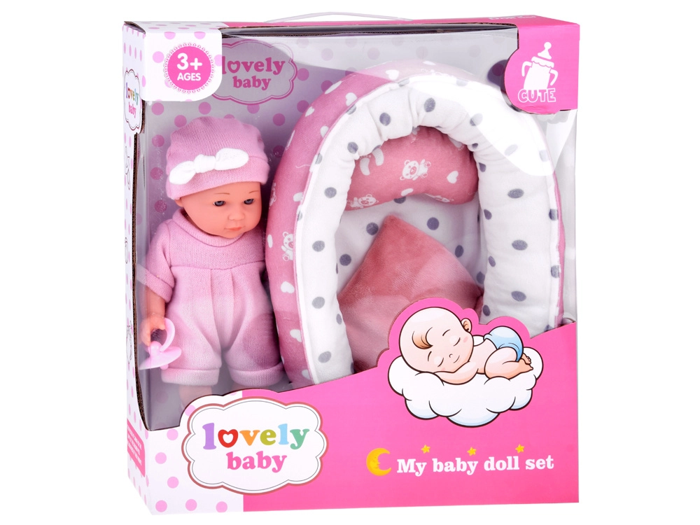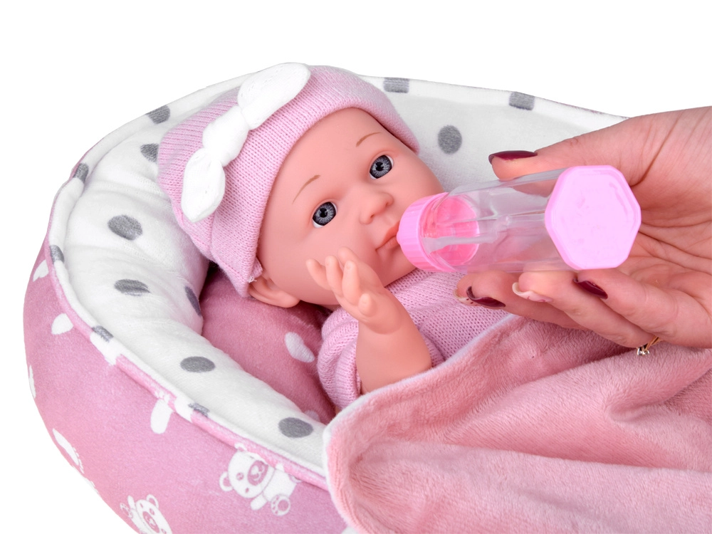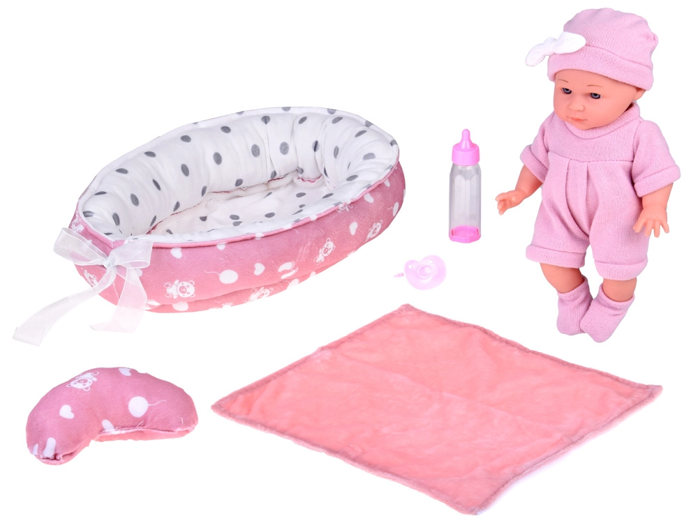 - Bambola con abitino rosa e cappellino, nido tessile con cuscinetto e copertina, biberon, ciuccio