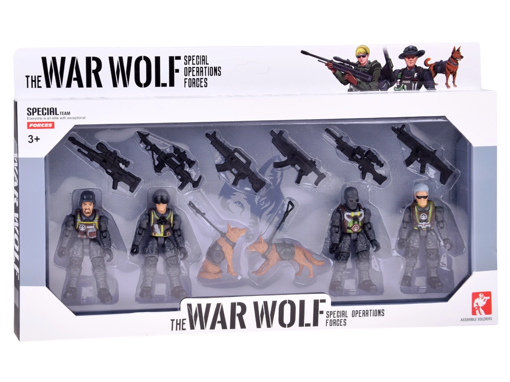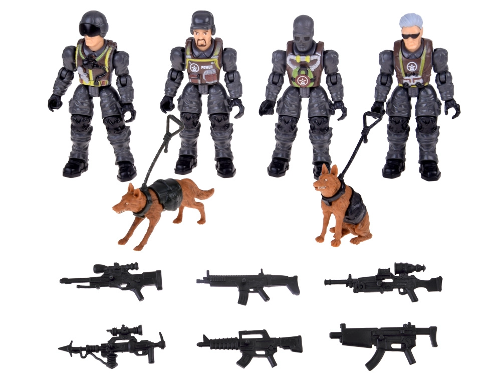 - Contenuto della confezione: 4 figure di soldati, 2 figure di cani, 6 modelli di armi
