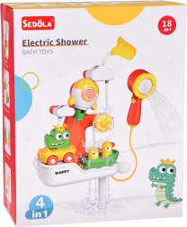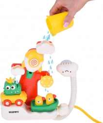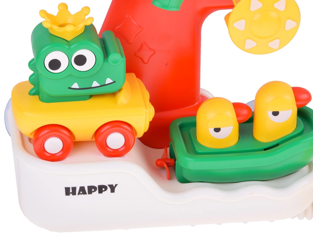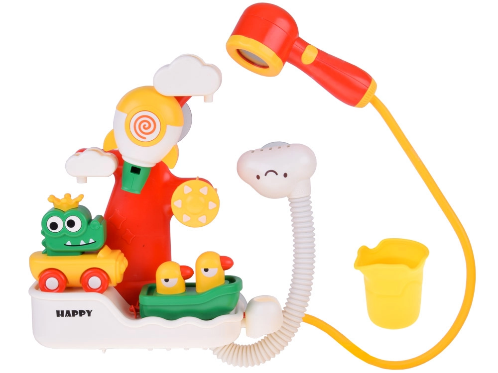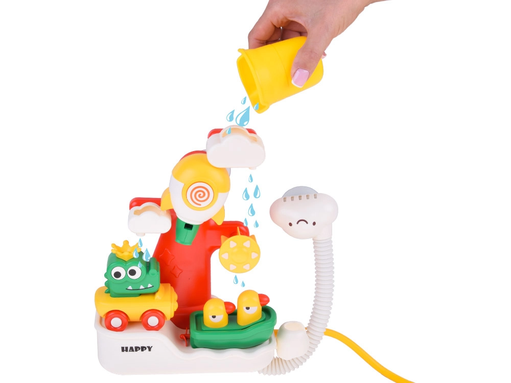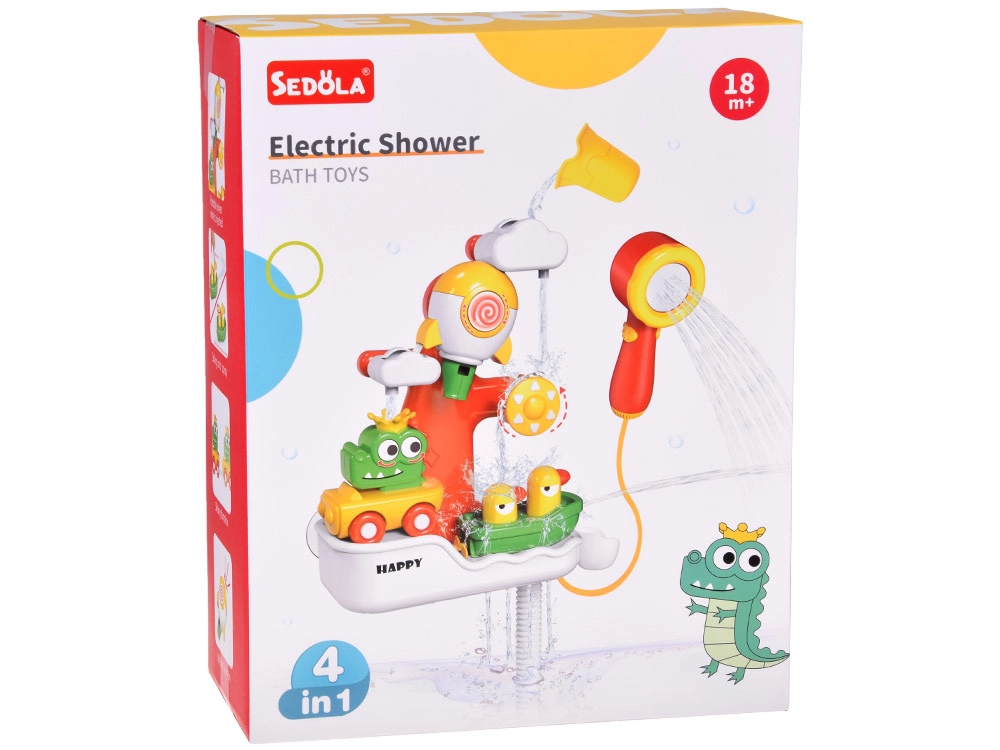 La simpatica stazione da bagno con coccodrillo offre ai bambini un divertimento acquatico senza fine. La pompa elettrica fa circolare l’acqua e crea l’effetto di una doccia continua, che fa girare le ruote e attiva vari effetti d’acqua. Inclusi anche paperelle galleggianti nella barchetta, una macchinina con coccodrillo e un bicchierino per travasare.