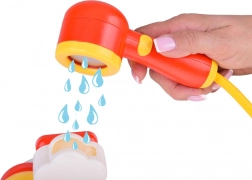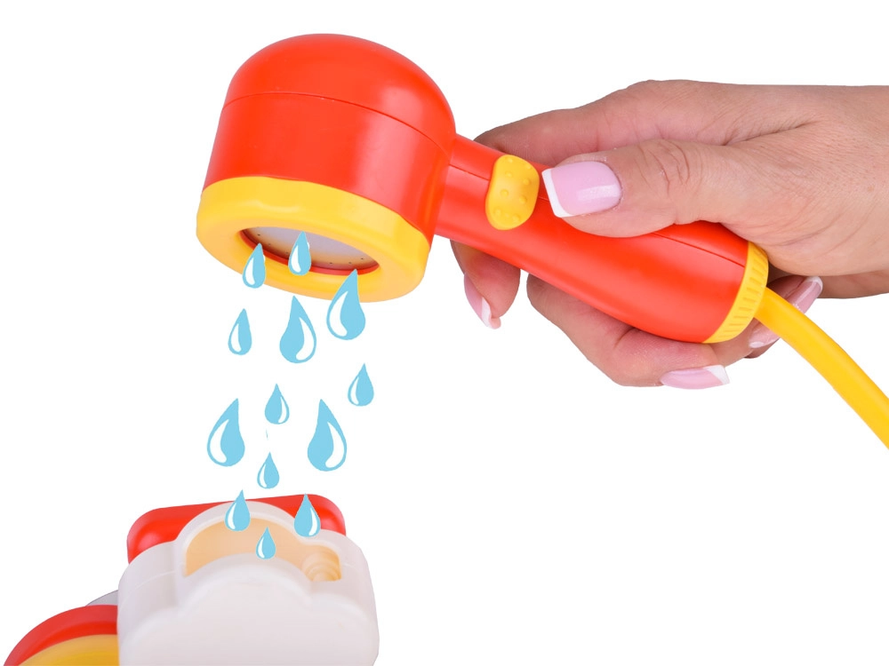 La pompa integrata aspira l’acqua e garantisce un flusso continuo verso la doccetta manuale. I bambini possono spruzzare, risciacquare e attivare le ruote ad acqua senza dover rabboccare continuamente.