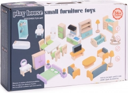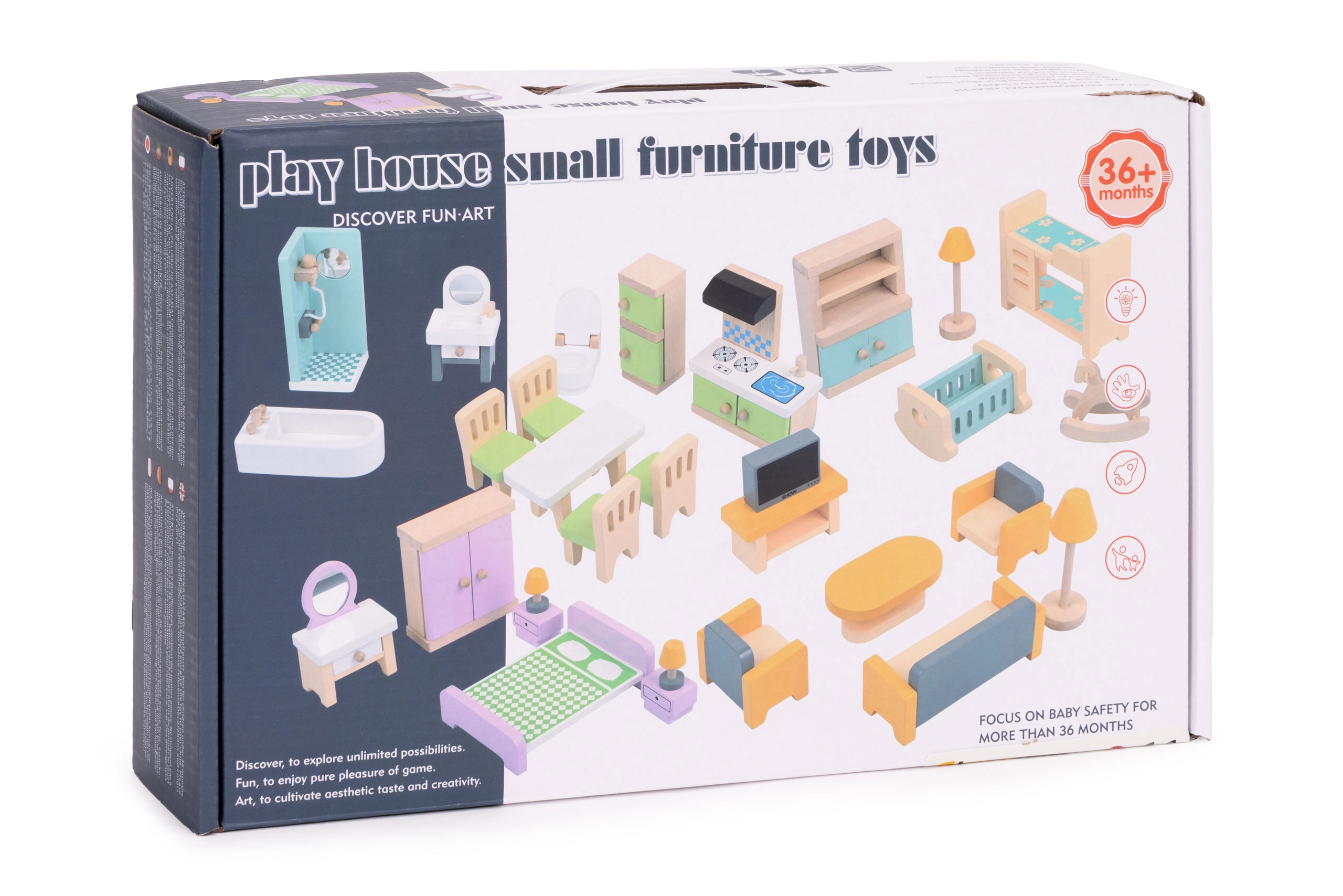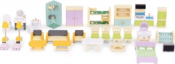 Il set include mobili per soggiorno, camera da letto, cucina, bagno e sala da pranzo – in totale 30 pezzi per infinite composizioni e scenari di gioco.