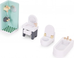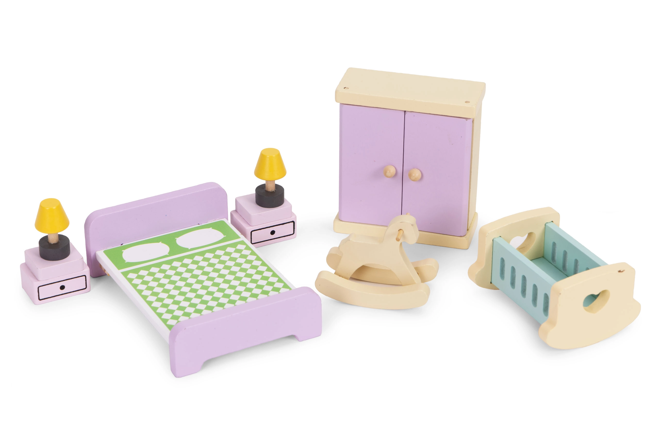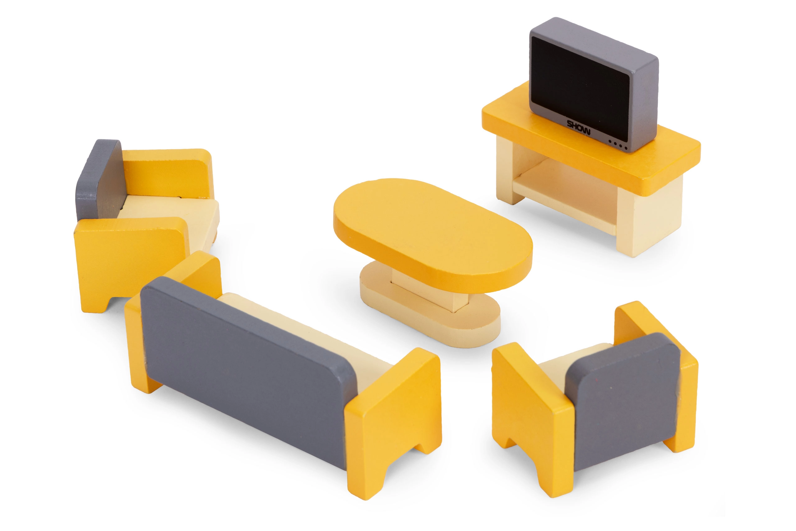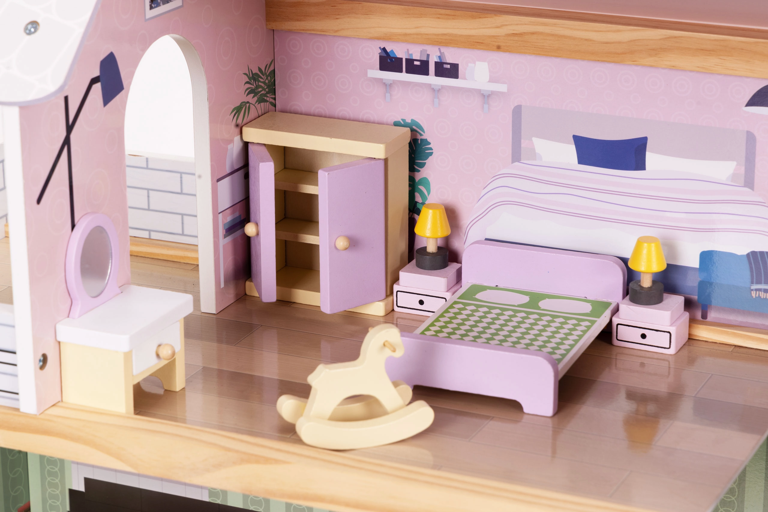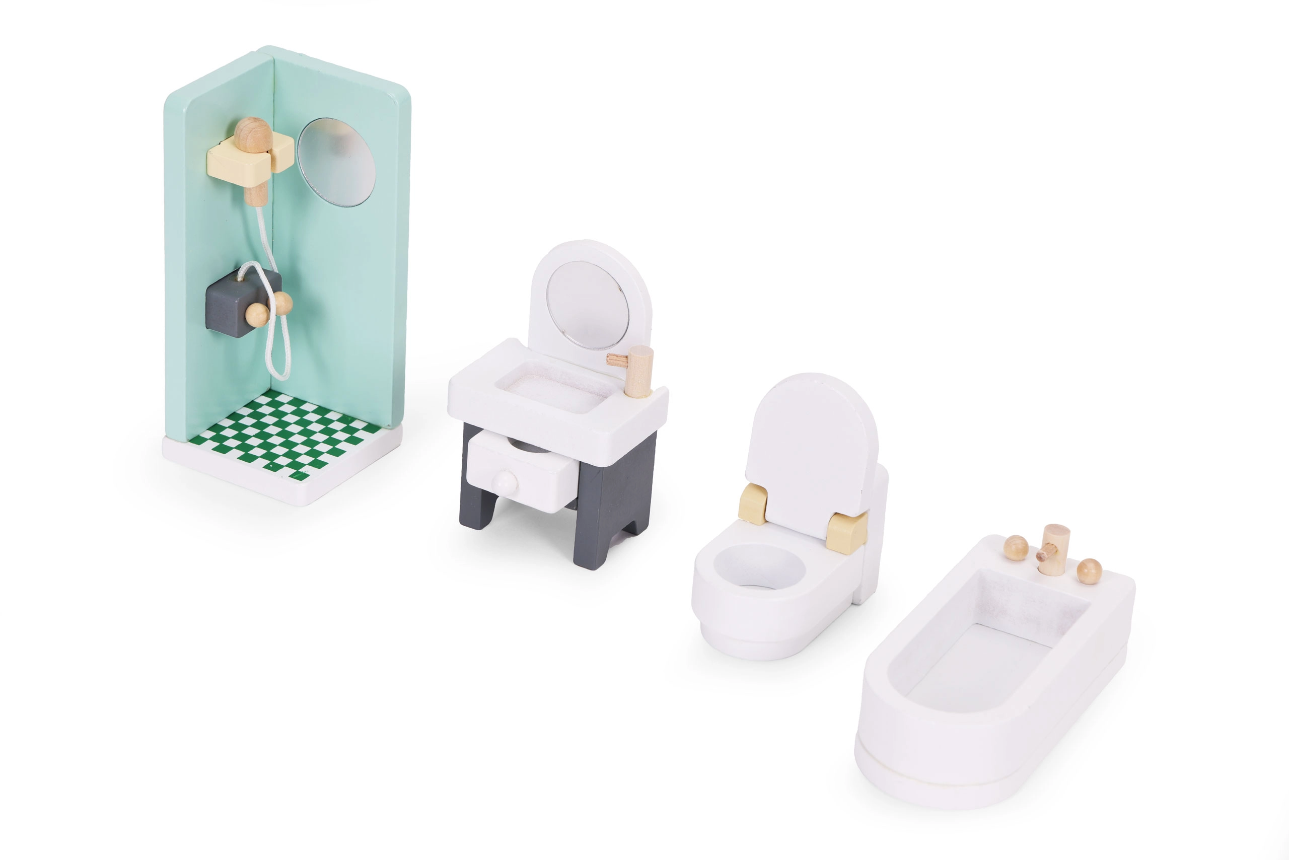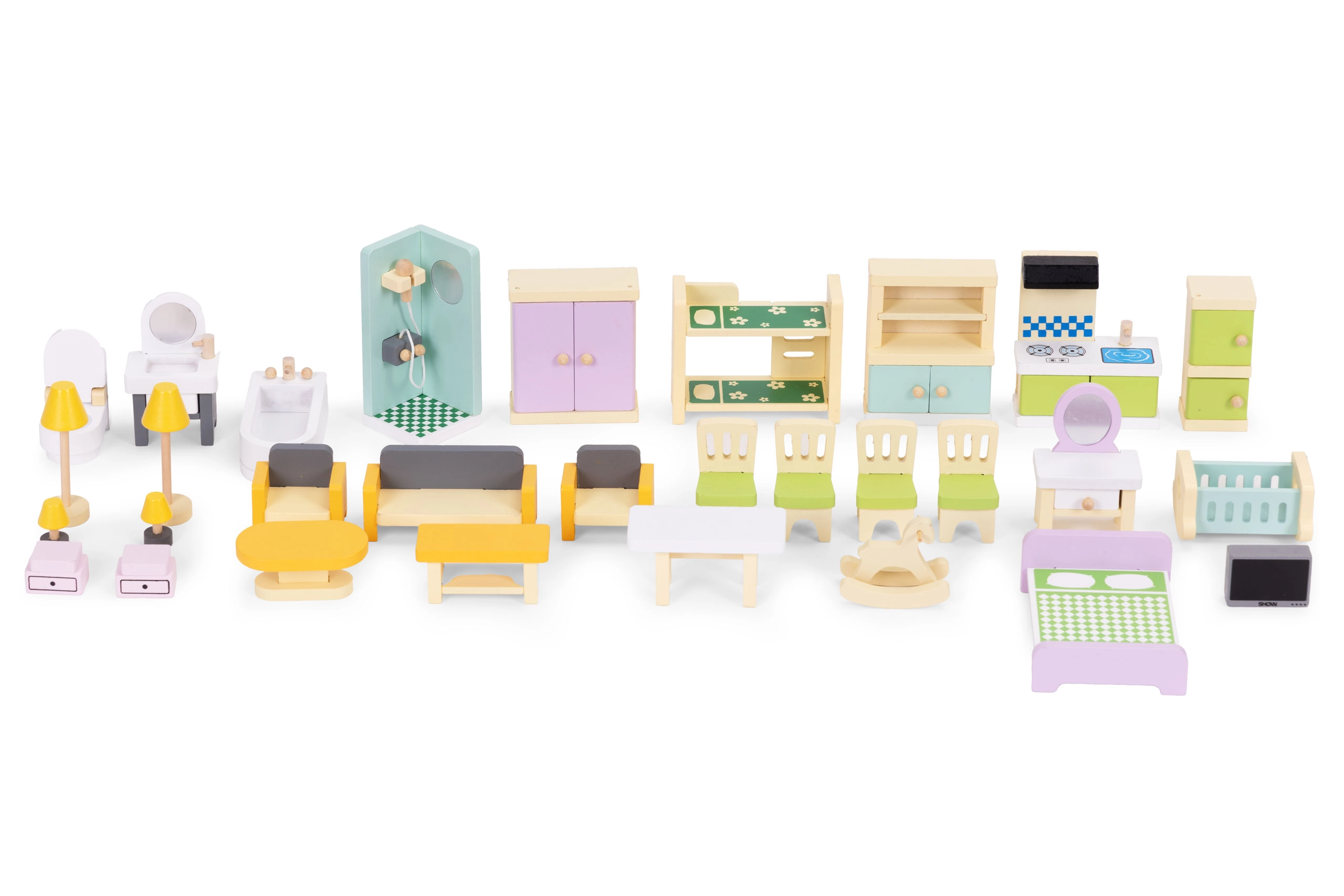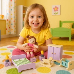 La pratica composizione per tutta la casetta include arredi per soggiorno, bagno, camera da letto, cucina e sala da pranzo. I pezzi sono adatti a bambole più piccole e si inseriscono anche in spazi ridotti – perfetti anche come set indipendente per il gioco libero.