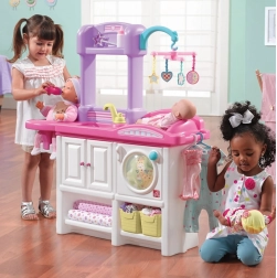 Il fasciatoio integrato e il lettino con giostrina girevole, completati da un lavandino con rubinetto orientabile, rendono la cura della bambola una parte naturale e divertente del gioco.