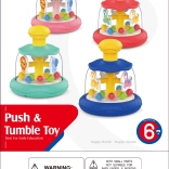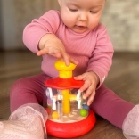 Questa colorata giostra rotante con cavallino e palline farà la gioia di ogni neonato. Basta premere il pulsante superiore giallo e la giostra interna si mette a girare – le palline si animano creando uno spettacolo coinvolgente e un delicato tintinnio. Il giocattolo unisce divertimento e sviluppo sensoriale in uno.
