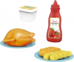 Pollo di plastica, 2× patatine fritte, 1× nugget, bicchierino con salsa, bottiglia di ketchup, 2 piattini