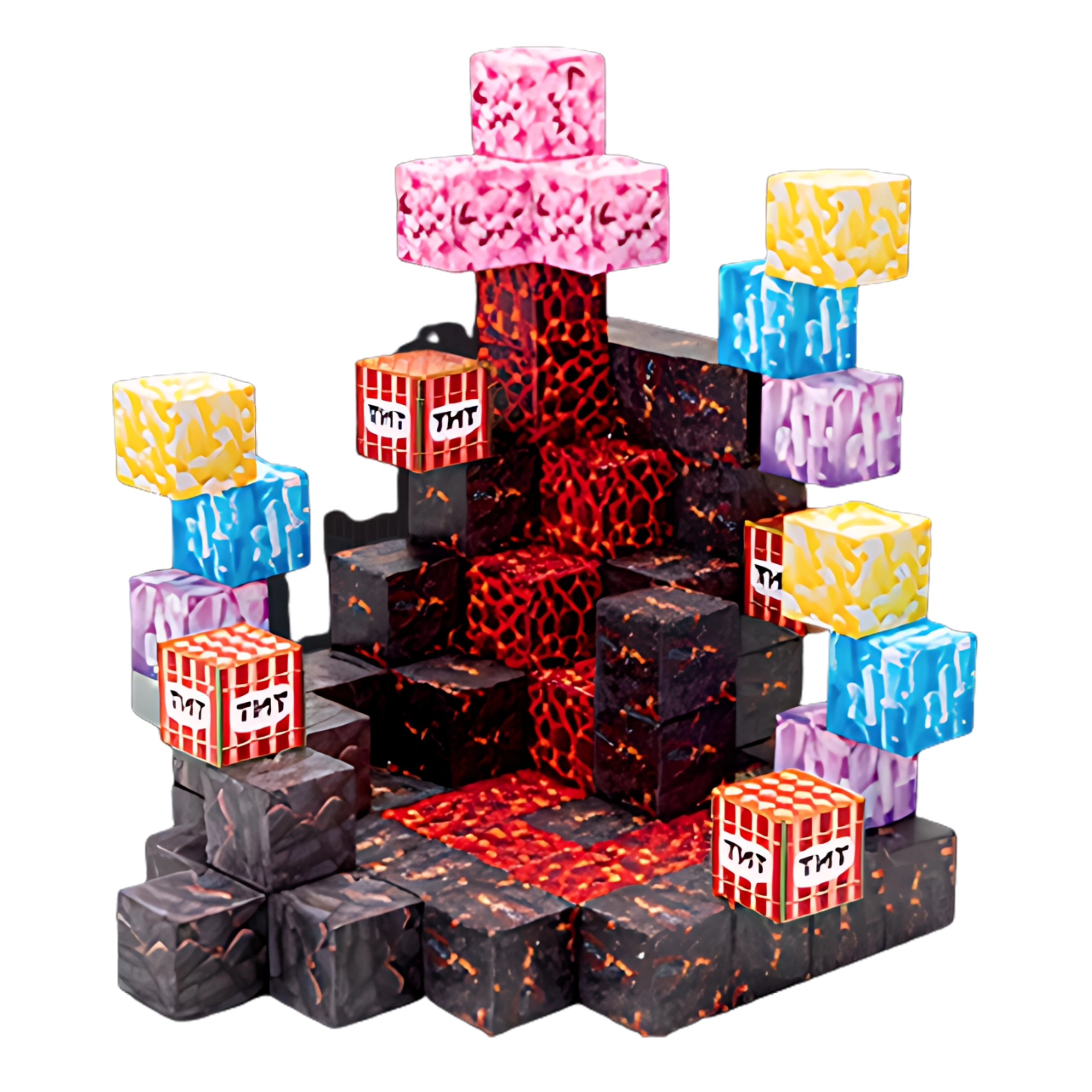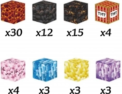 - 30× cubi rosso-neri; 12× cubi grigi; 16× cubi nero‑arancioni; 4× cubi TNT; 4× cubi rosa; 3× cubi blu; 3× cubi viola; 2× cubi gialli