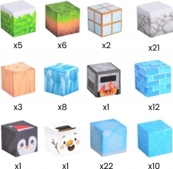 - 6× cubo (motivo ghiaccio); 14× cubo (motivo pietra); 3× cubo (motivo legno); 16× cubo (motivo foglie); 18× cubo (motivo ghiaccio blu); 3× cubo (motivo pinguino); 1× cubo (motivo orso polare); 13× cubo (motivo pietra sotto la neve); 1× cubo (motivo sassolino/fornello); 1× cubo (senza motivo specificato)