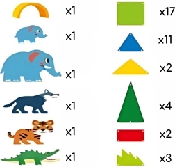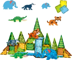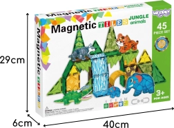 Le tessere magnetiche di varie forme e colori si collegano facilmente e saldamente grazie ai magneti integrati. I bambini possono creare costruzioni colorate con elementi naturali come la cascata a effetti (mobile), archi, cespugli e alberi, e animare la scena con le figurine di animali: elefante, tigre, coccodrillo e lupo.
