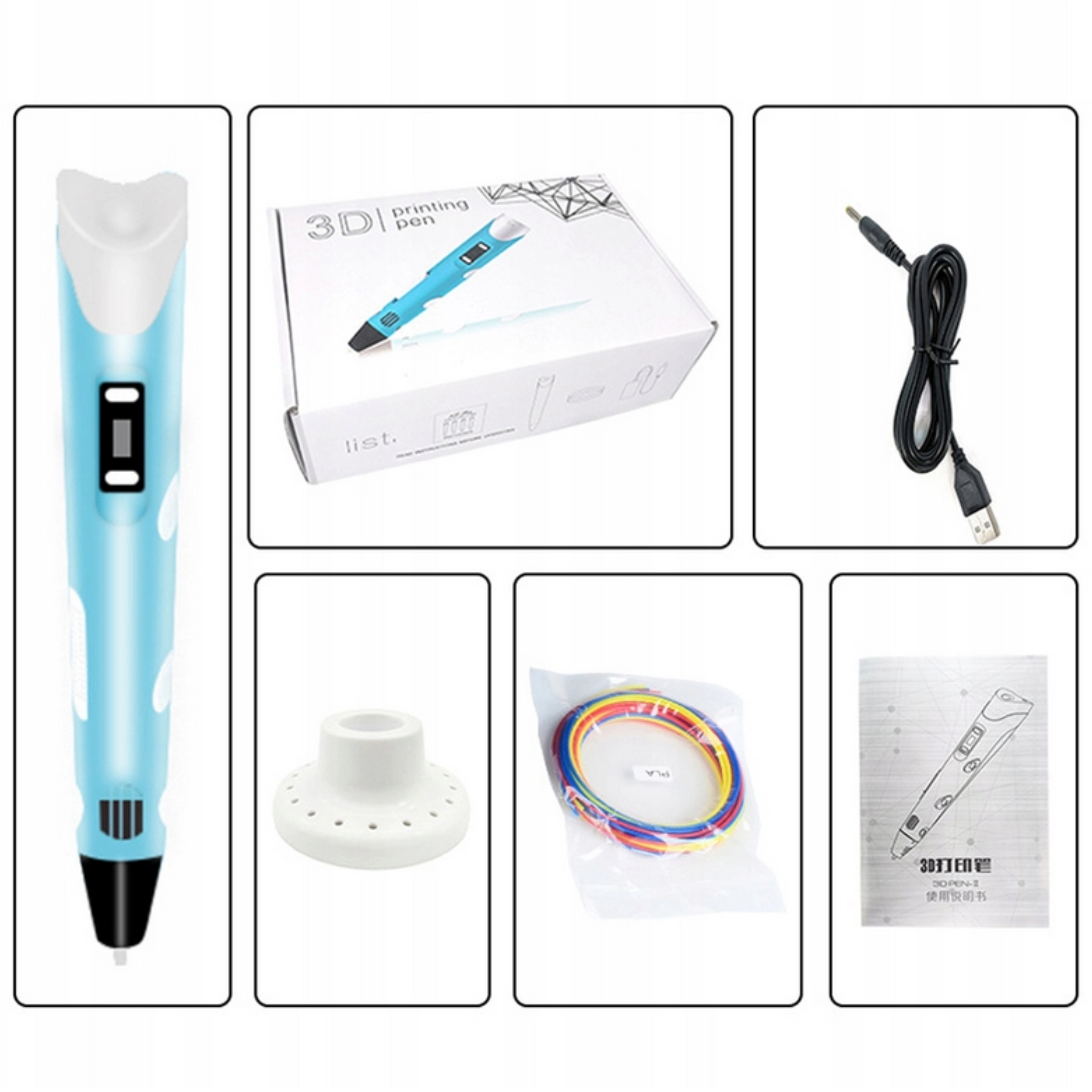 - Penna 3D (1 pz), filamento PLA 12 × 3 m (colori assortiti), cavo USB (1 pz), manuale (EN)