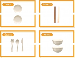 • Accessori ricchi: posate (forchette, cucchiai, bacchette, palette), spezierine e boccette con “salsa”.