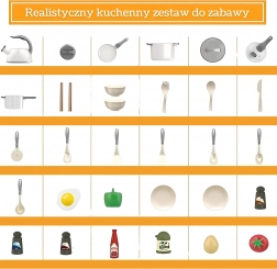• Dotazione realistica: pentole con coperchi, padella con uovo al tegamino, teiera, piatti e ciotole.