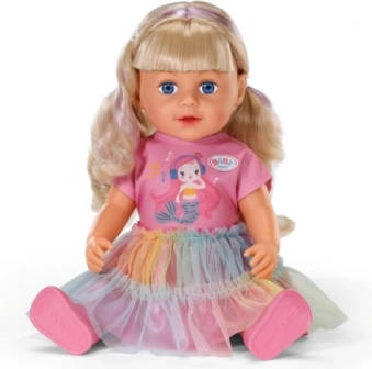 Carla indossa una graziosa maglietta con stampa, una gonna di tulle arcobaleno e scarpe alla moda. Il corpo rigido è adatto anche all’acqua, così potrai divertirti durante il bagnetto in vasca. L’ottima qualità e i materiali resistenti piaceranno a bambini e genitori.